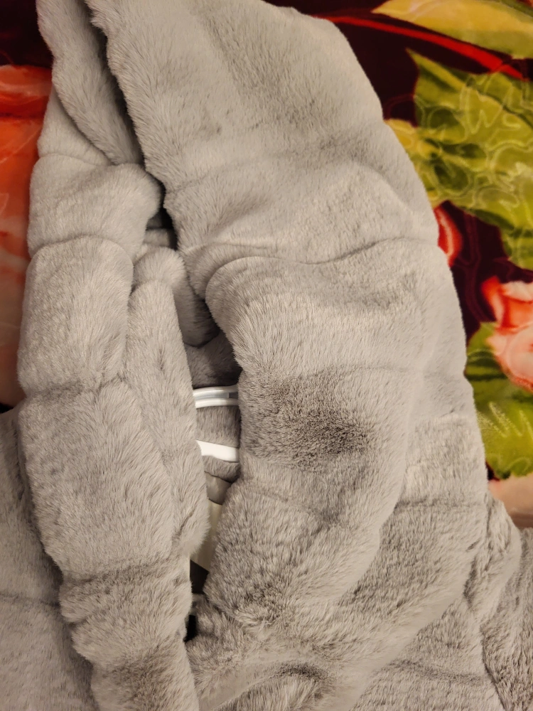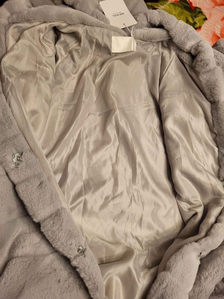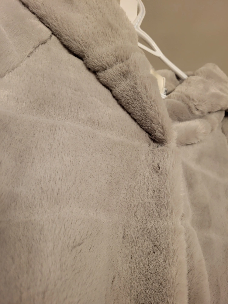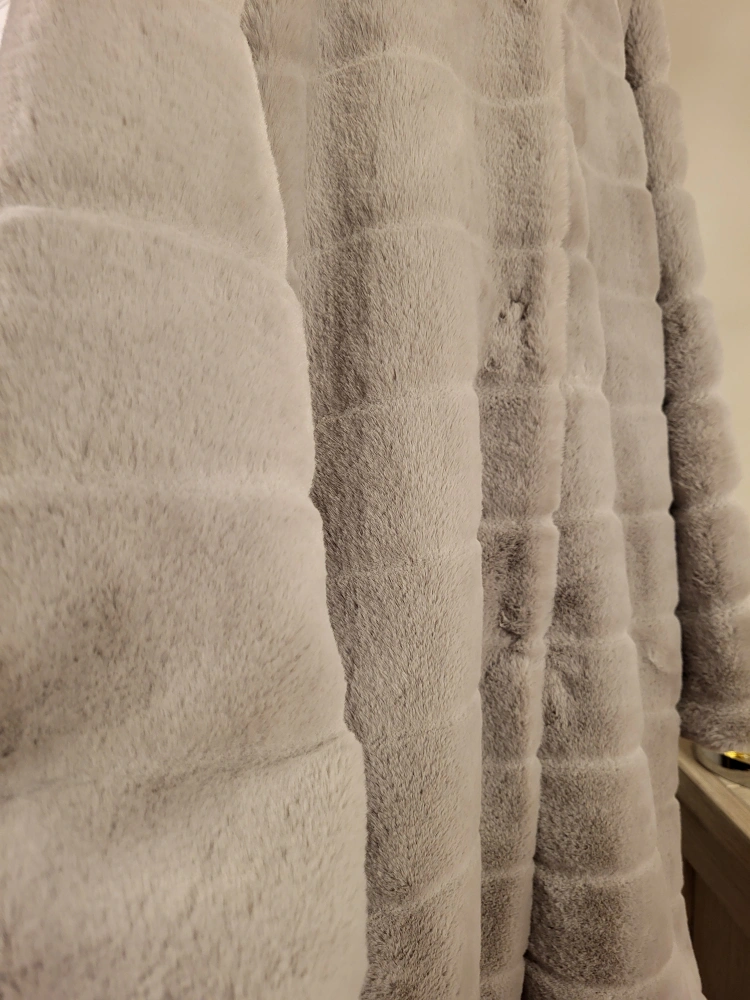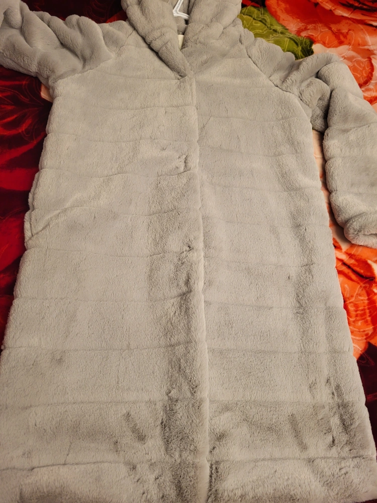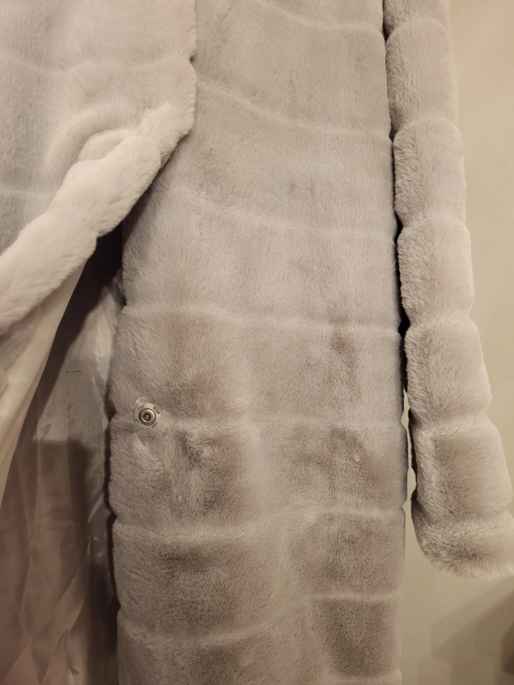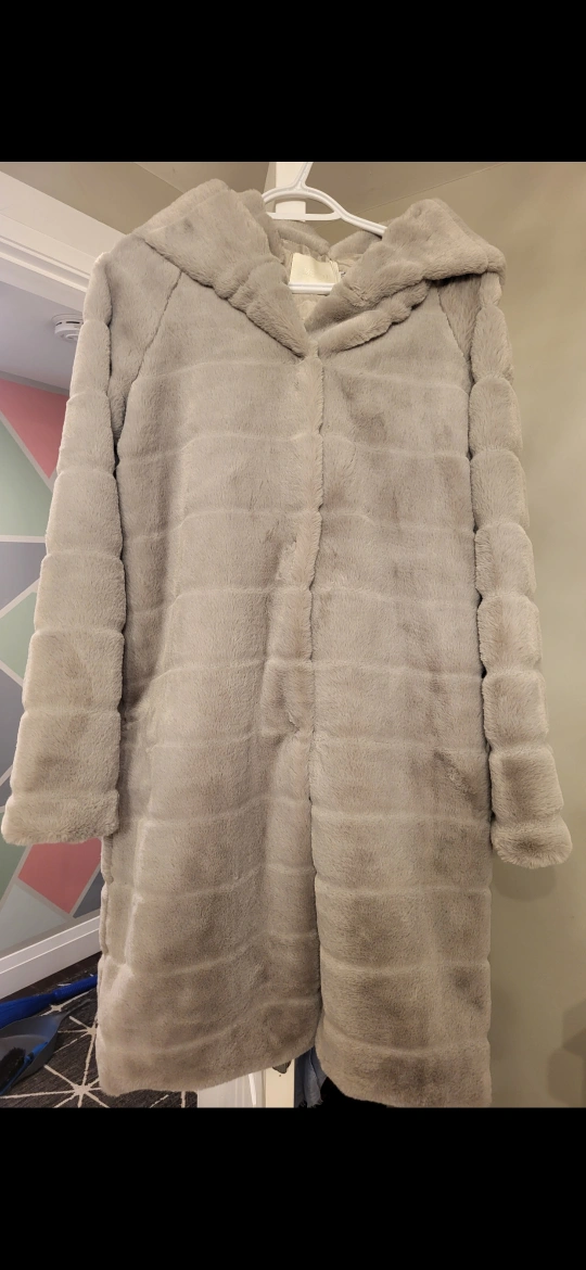 Long grey faux fur coat. Features a large hood and long sleeves. Very soft and cozy. Silky lining. Snap closure, from London England. Size Large. $100.