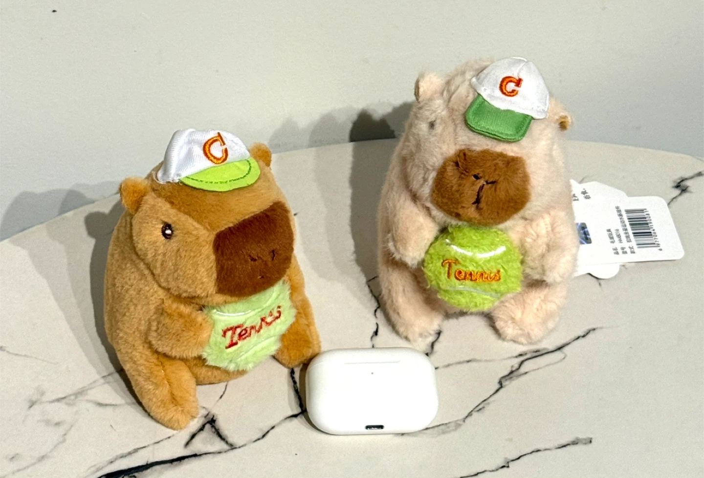 These adorable capybara plushies are ready for a new home! They're wearing cute little tennis outfits, complete with a hat and a tennis ball. They're soft, cuddly, and would make a great addition to any plush collection