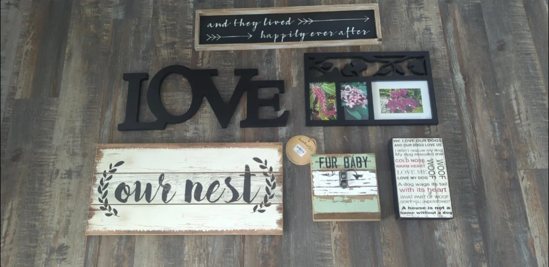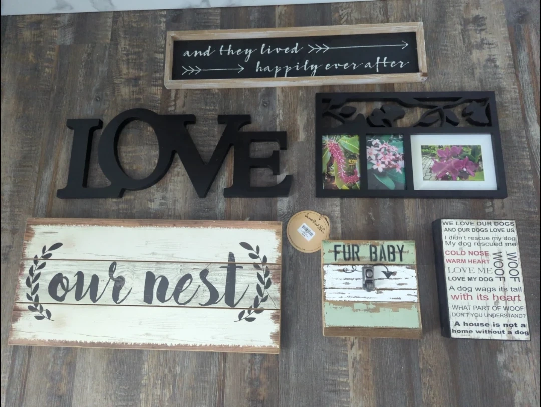 A collection of home decor signs to add some charm to your space! Includes a black 'LOVE' sign, a rustic 'Our Nest' sign, and a cute 'Fur Baby' sign. Perfect for adding a personal touch to any room