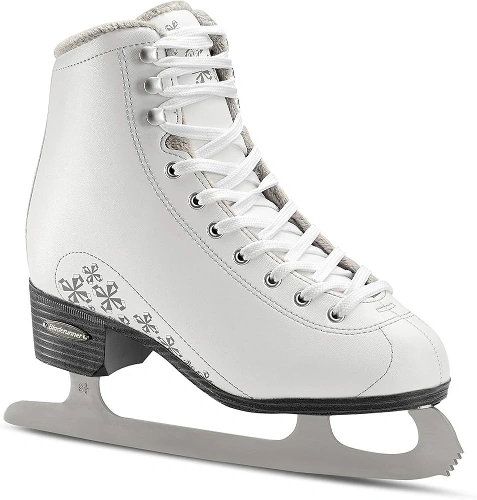 White women's ice skates with a supportive boot and comfortable lining. Features a patterned design on the side and durable blades. Perfect for recreational skating!