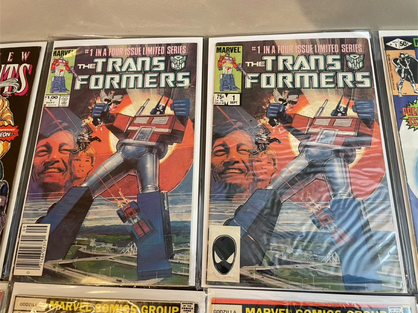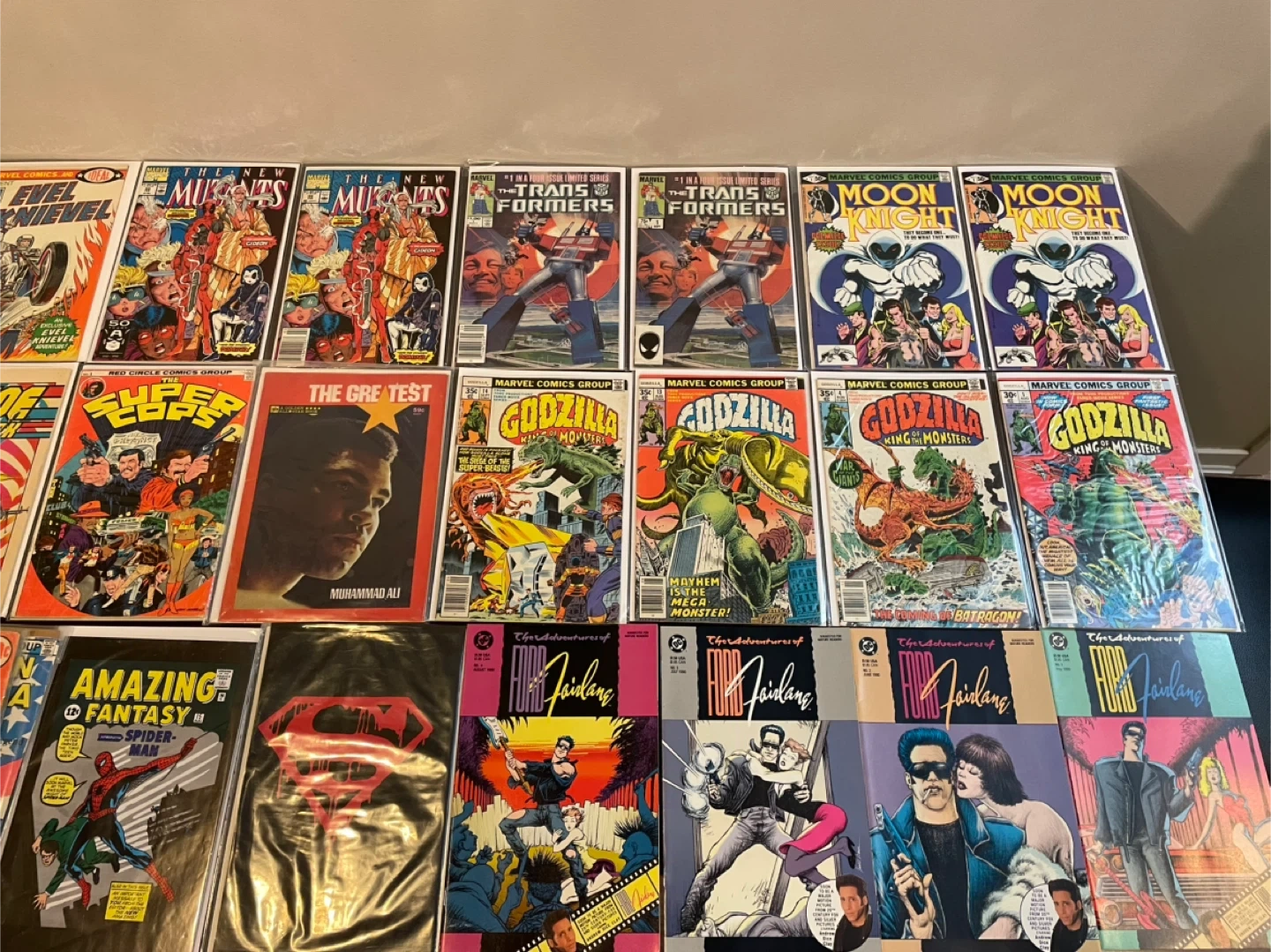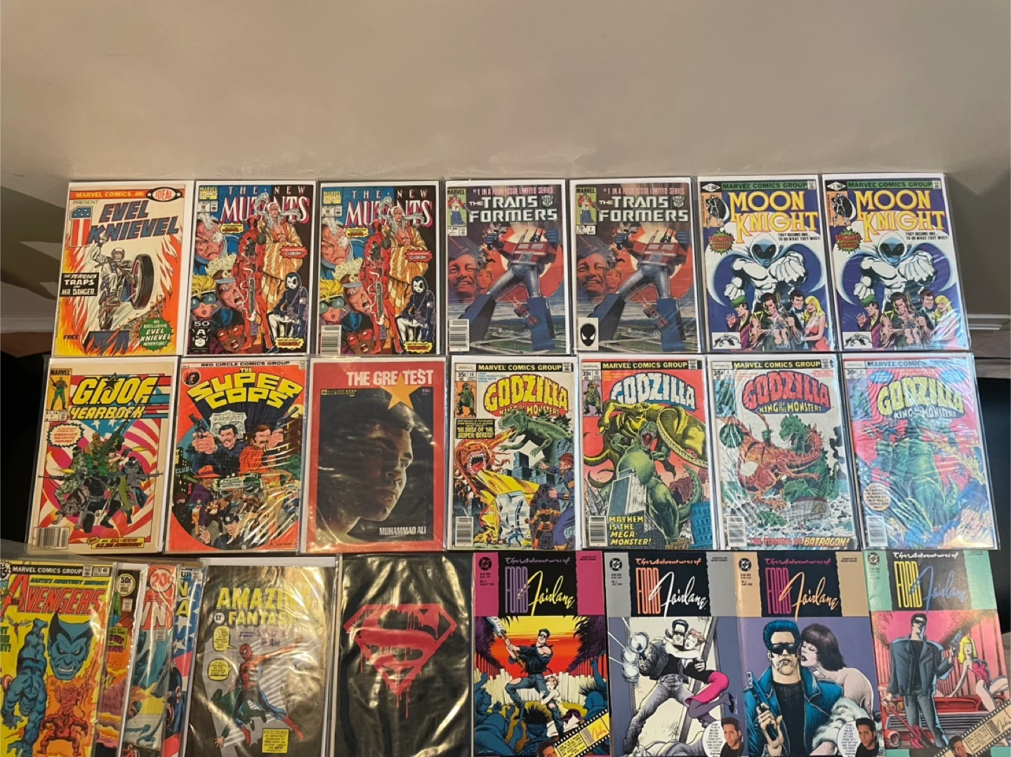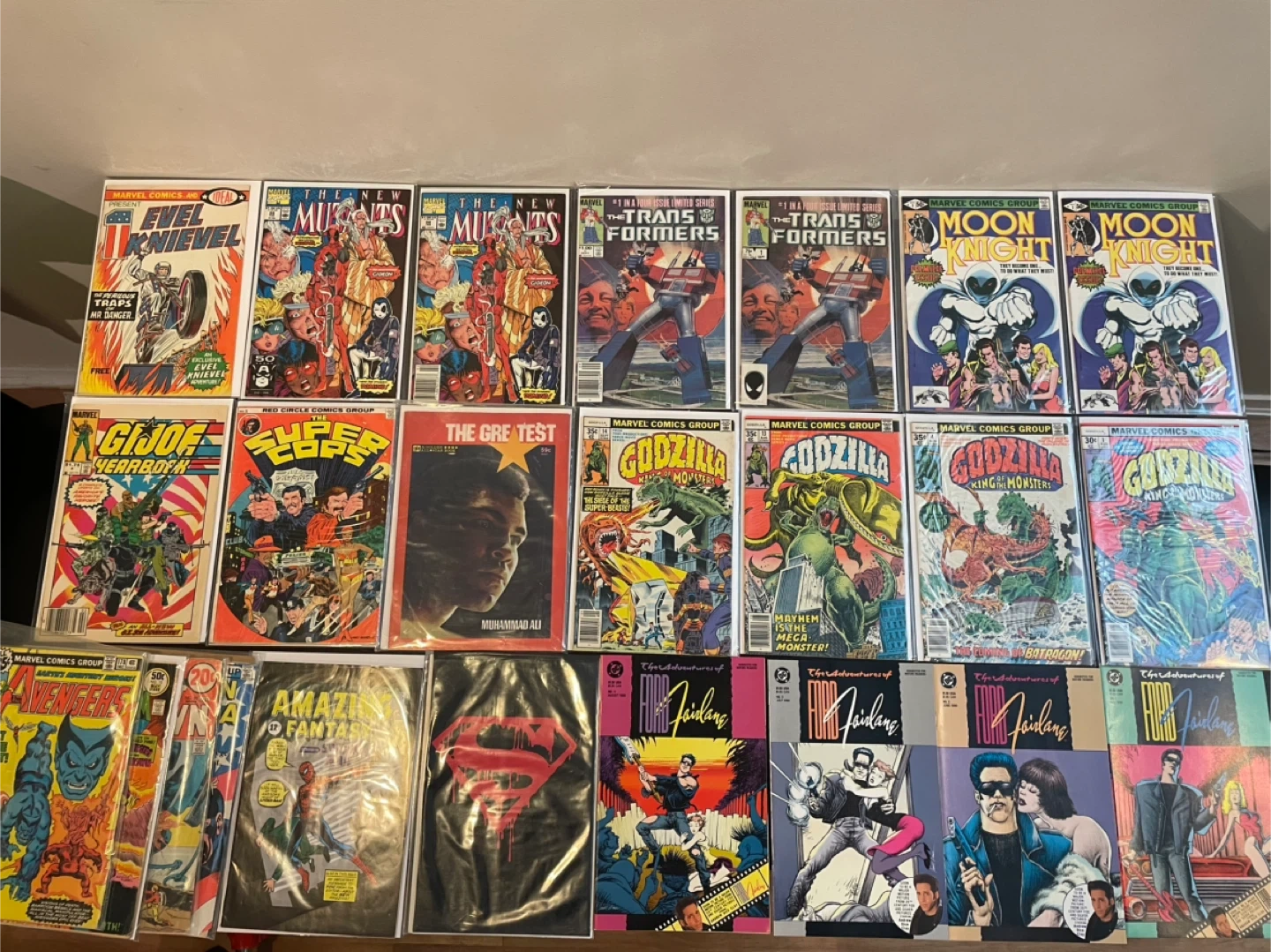 A varied collection of comic books featuring titles like The New Mutants, Transformers, G.I. Joe, Godzilla, Moon Knight, and Amazing Fantasy. Includes issues from Marvel Comics and DC Comics. These comics are great for collectors and fans of classic comic art and stories. 25$ and up