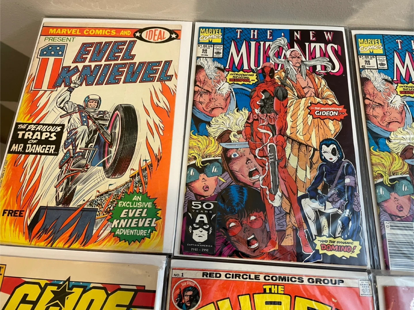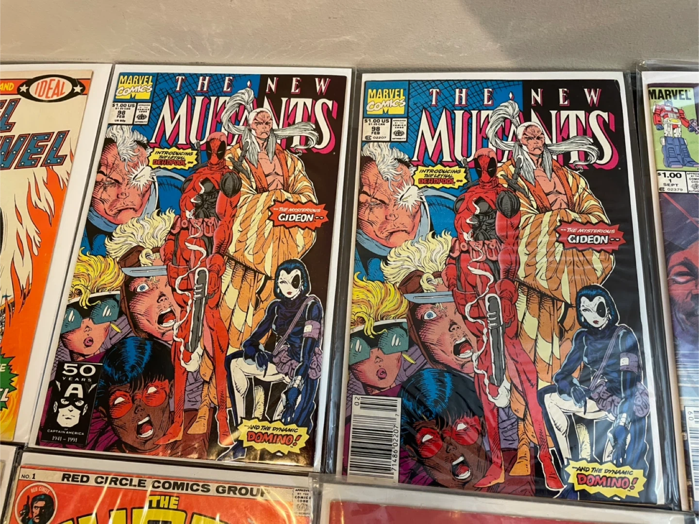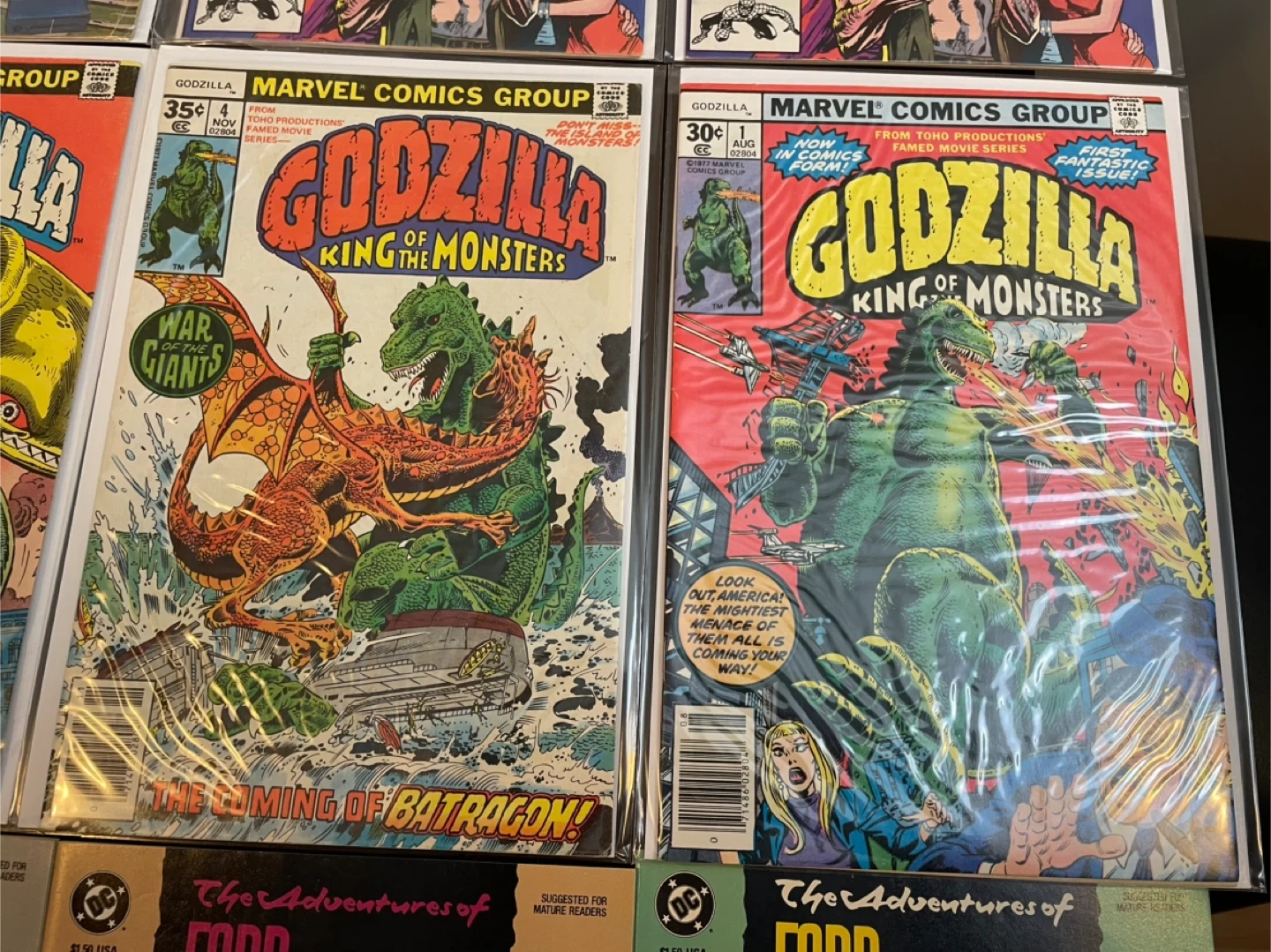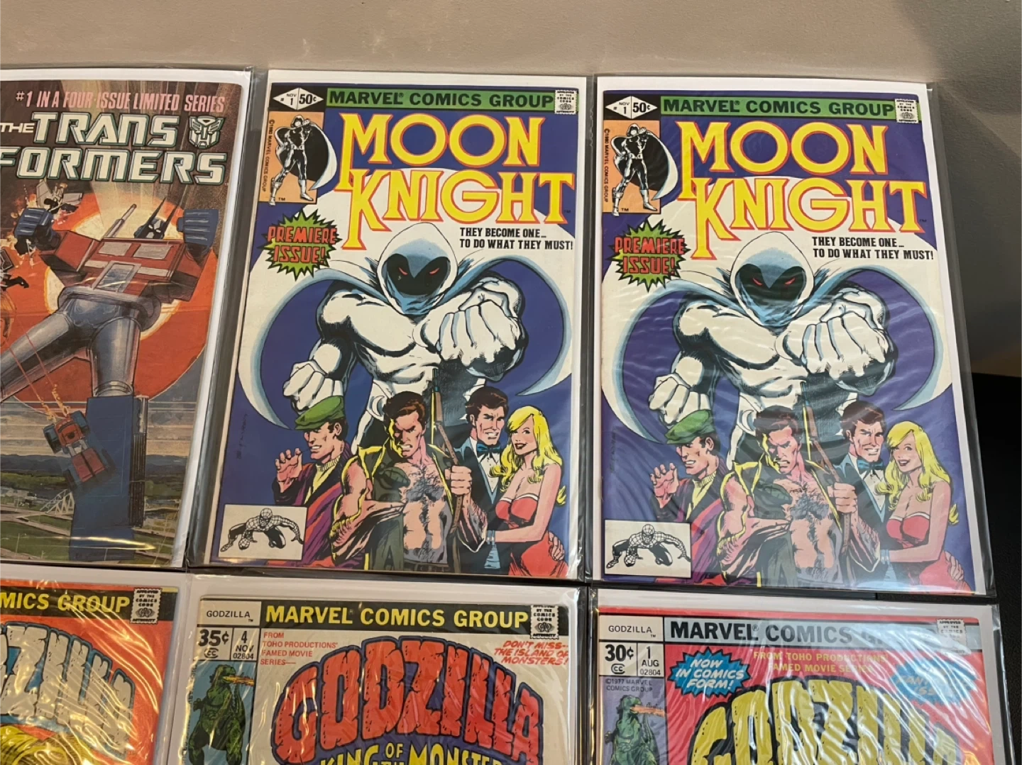A varied collection of comic books featuring titles like The New Mutants, Transformers, G.I. Joe, Godzilla, Moon Knight, and Amazing Fantasy. Includes issues from Marvel Comics and DC Comics. These comics are great for collectors and fans of classic comic art and stories. 25$ and up