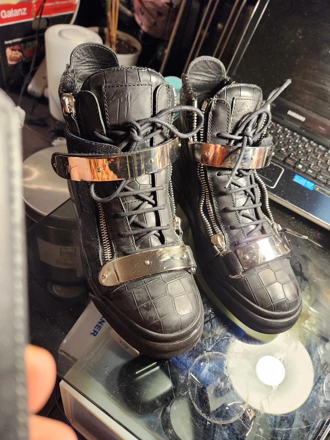 Black high-top sneakers with a crocodile print texture. Features silver buckle and zip detailing. Leather material.