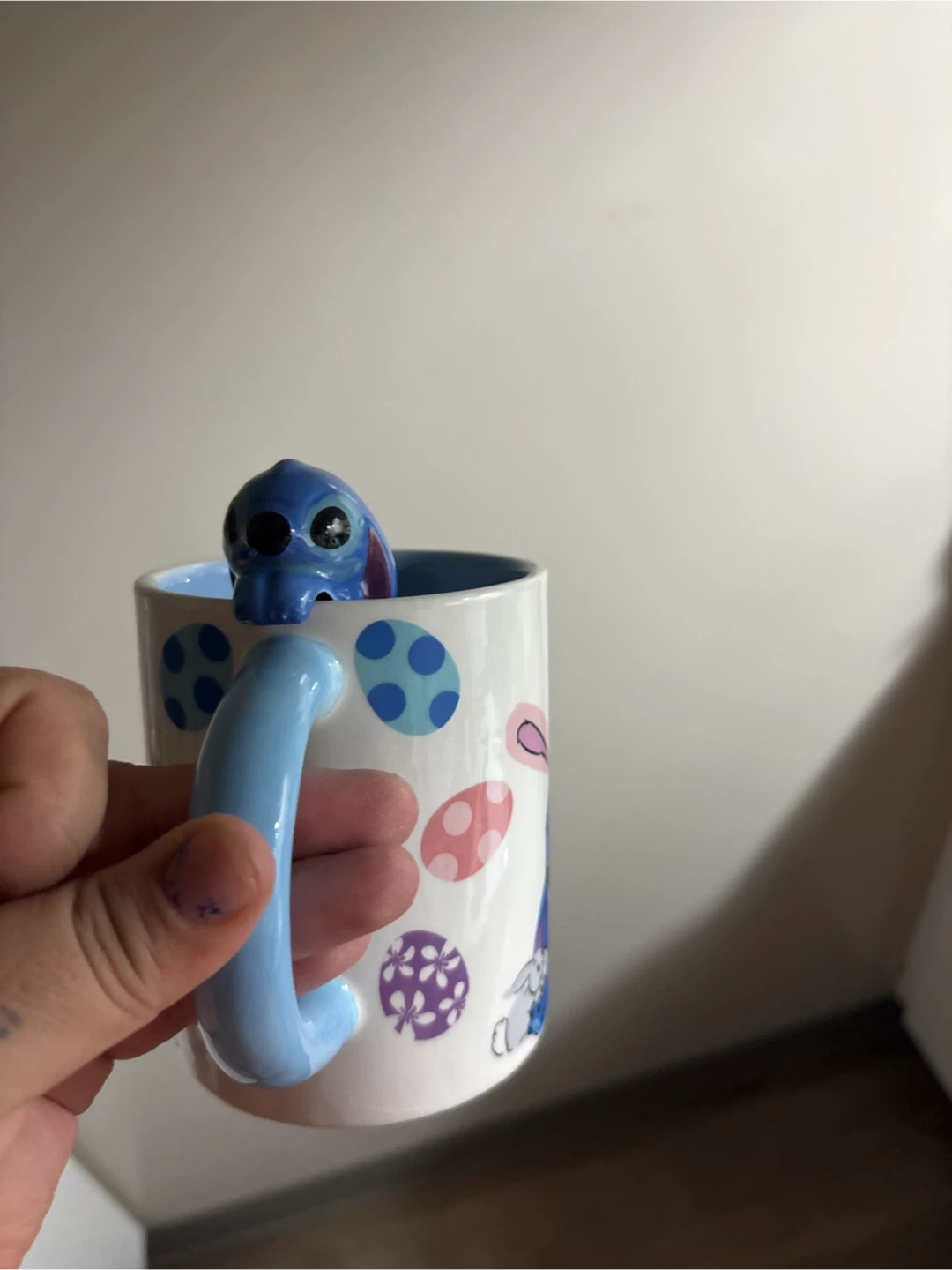 Cute mug featuring Disney's Stitch dressed as an Easter bunny. It's got a small Stitch figurine peeking out from behind the rim. Great for fans of Stitch or for enjoying your morning coffee or tea!