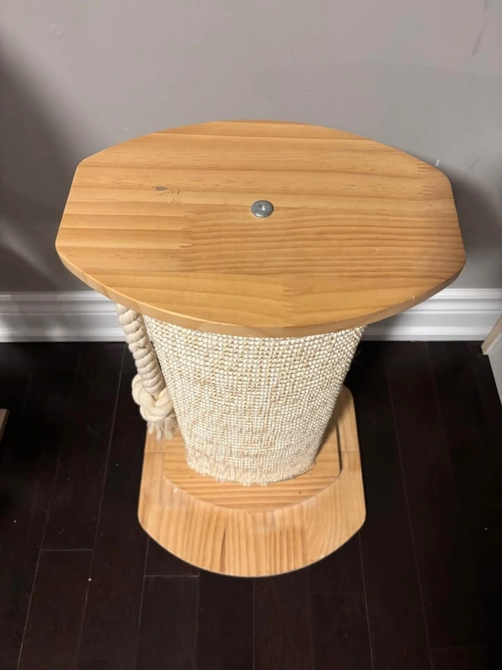 Great cat scratching post with a wood base and top. Comes with a rope toy attached. About 58cm tall, base is 36cm x 38cm.