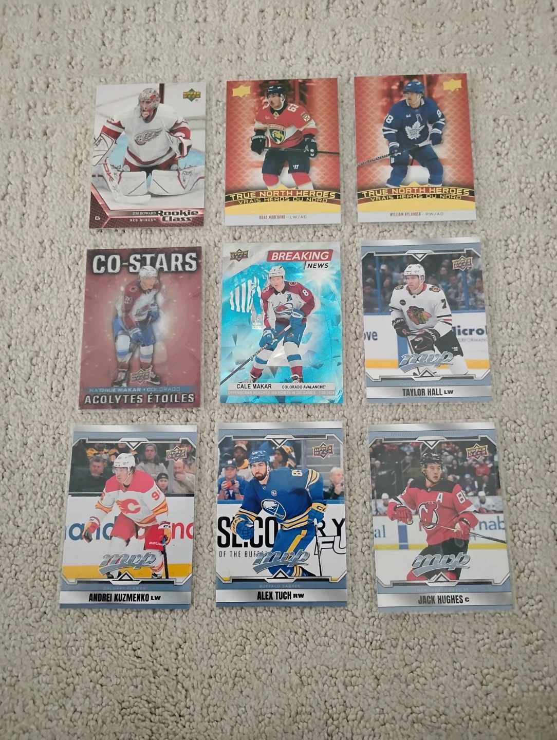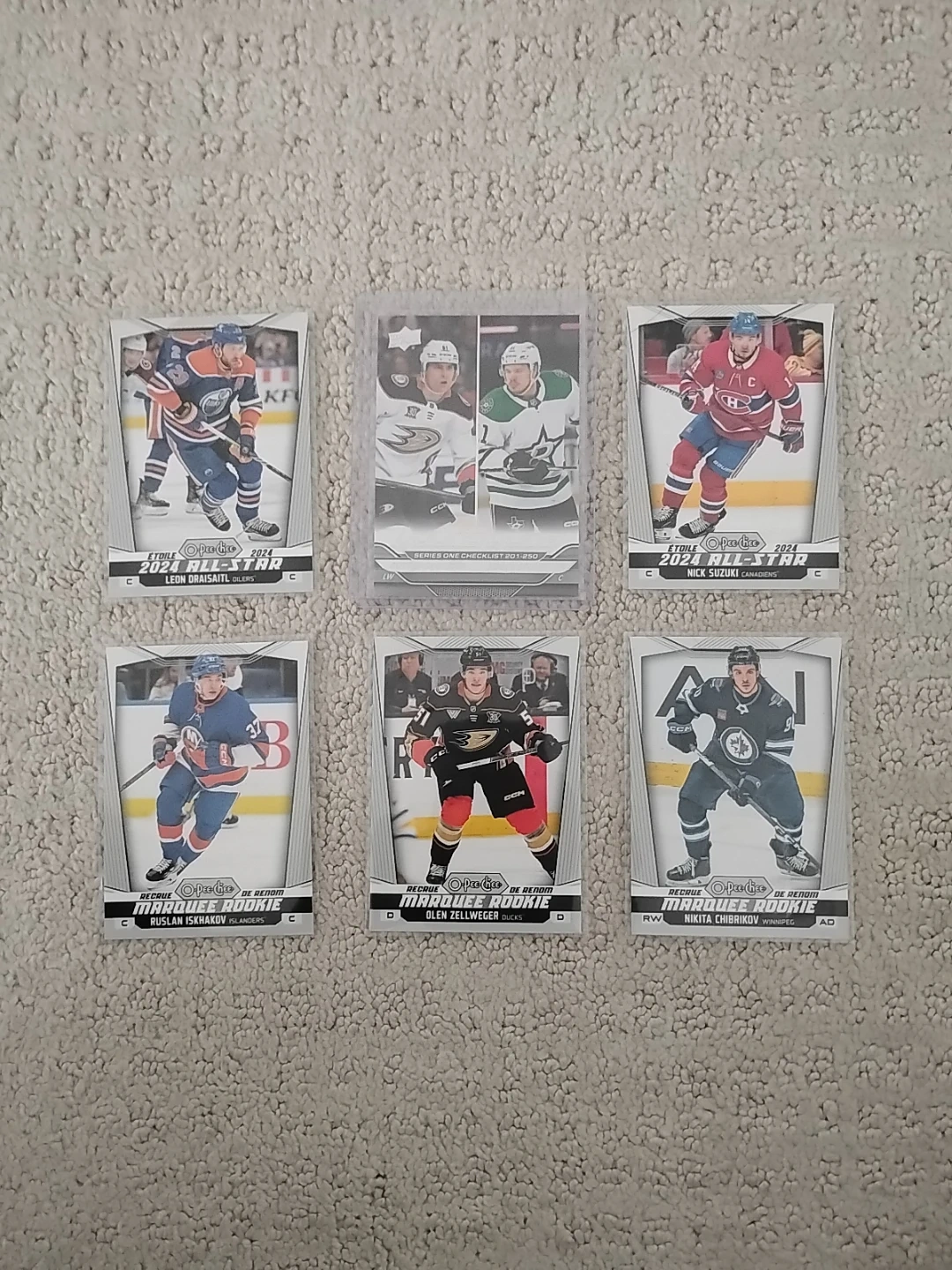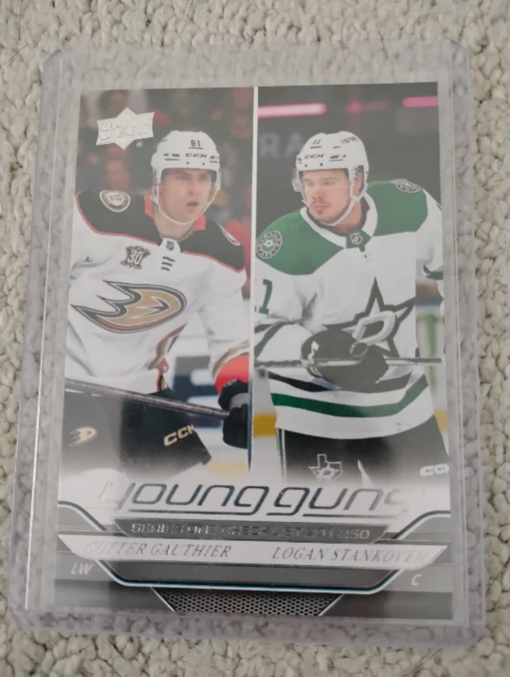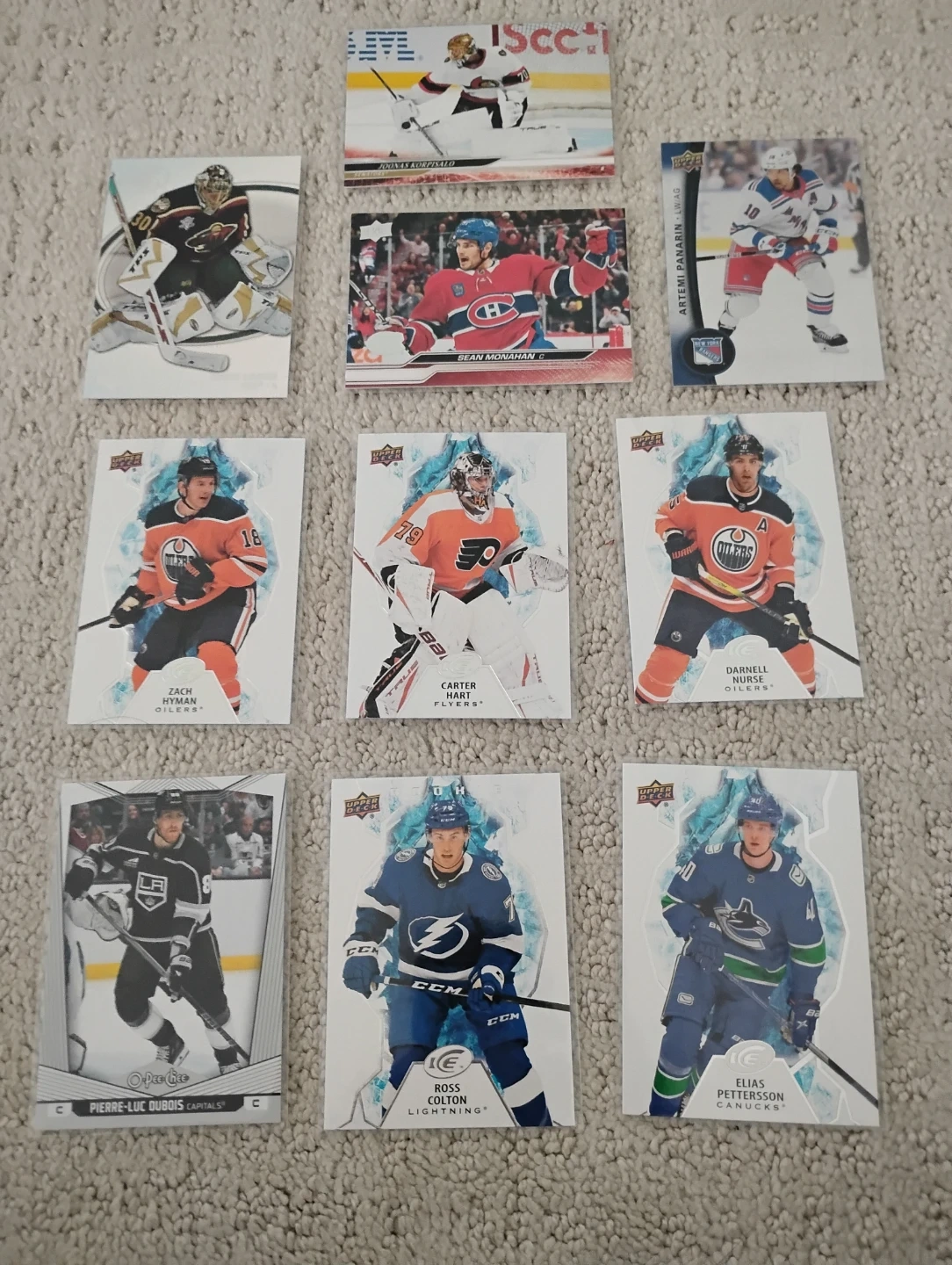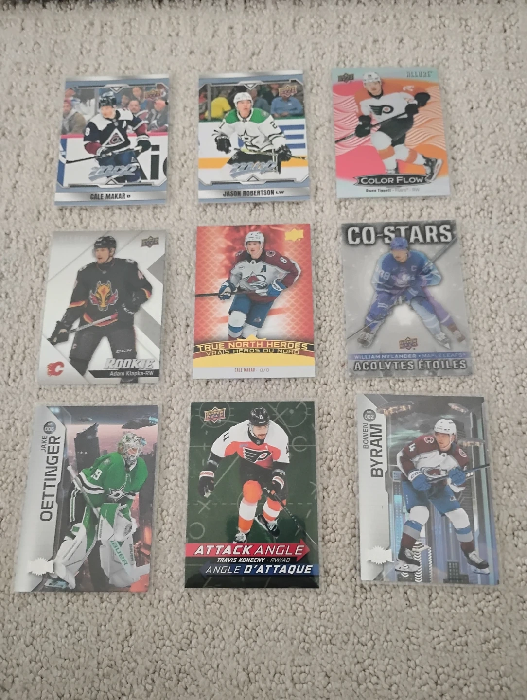 This collection includes 200 various Upper Deck and O-Pee-Chee modern and vintage NHL hockey cards, along with a few inserts from other brands, featuring multiple players and team affiliations. Cards shown include rookie cards, all-stars, and special inserts. It's a great mix for any hockey card enthusiast! Includes Logan Stankoven and Cutter Gauthier Young Gun checklist card too. The price is negotiable.