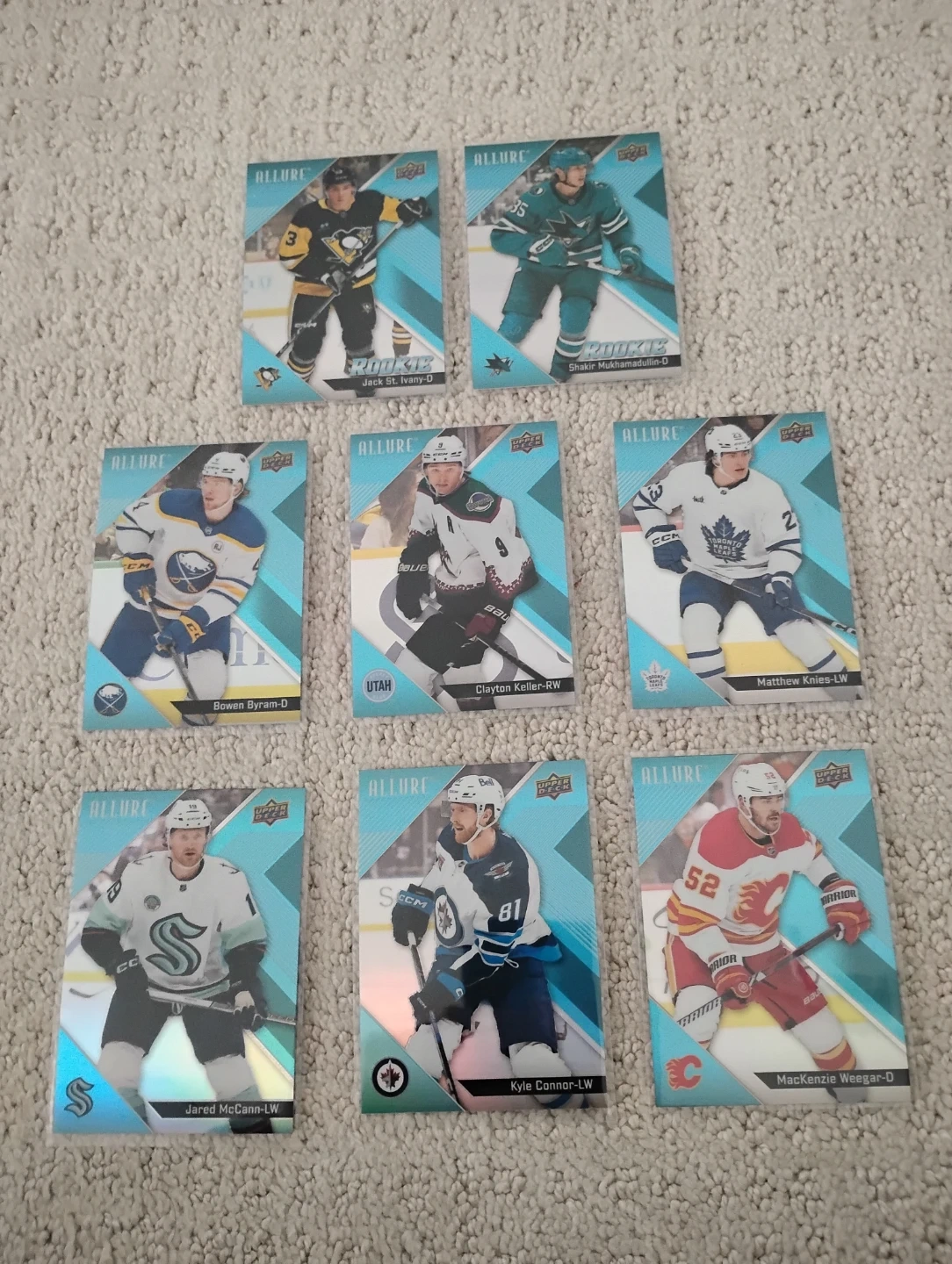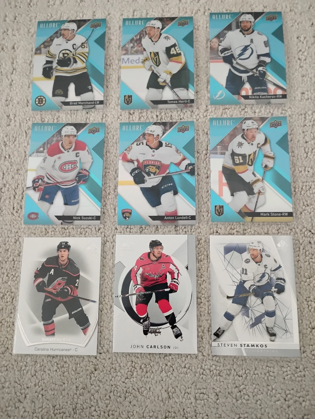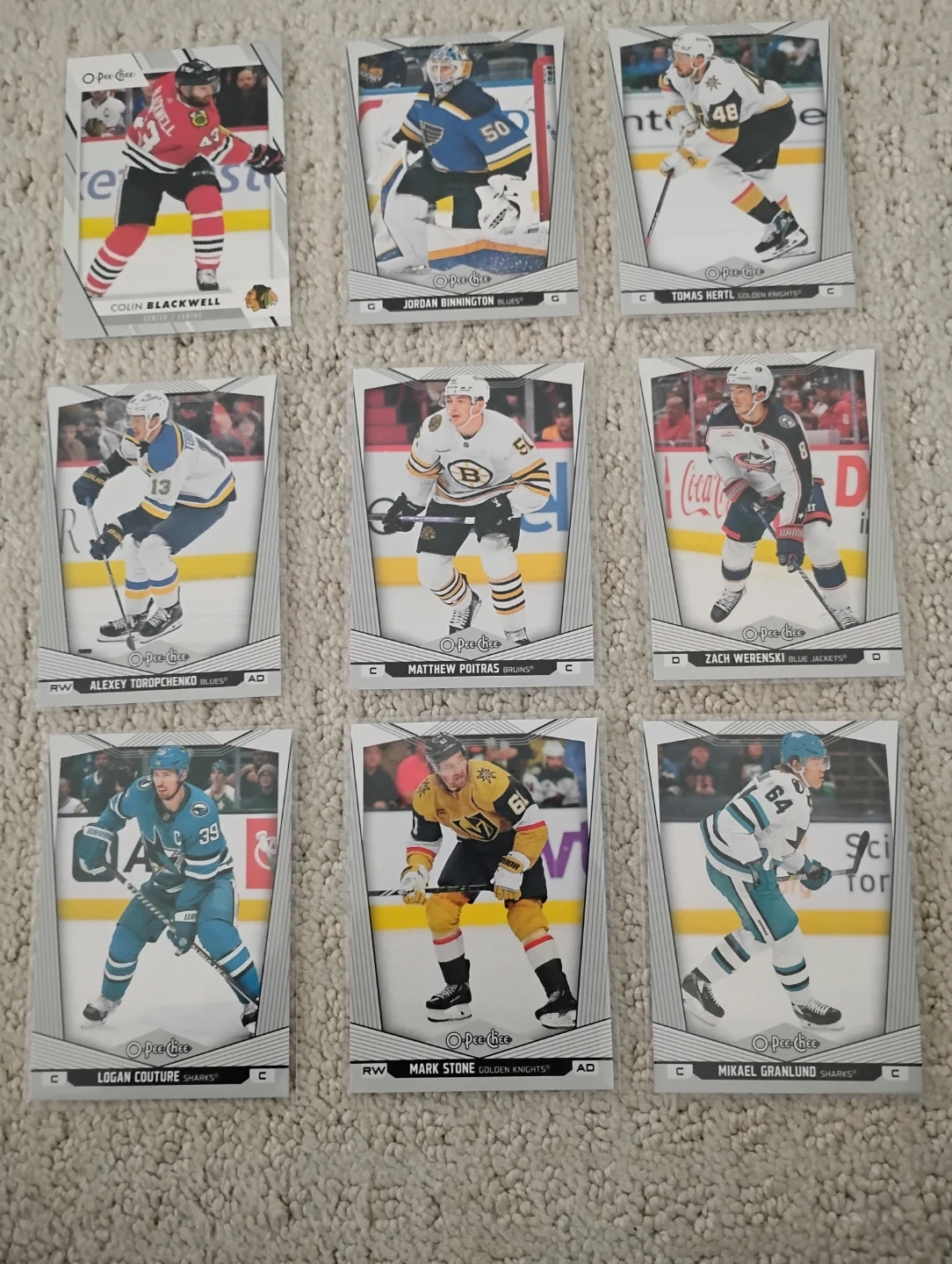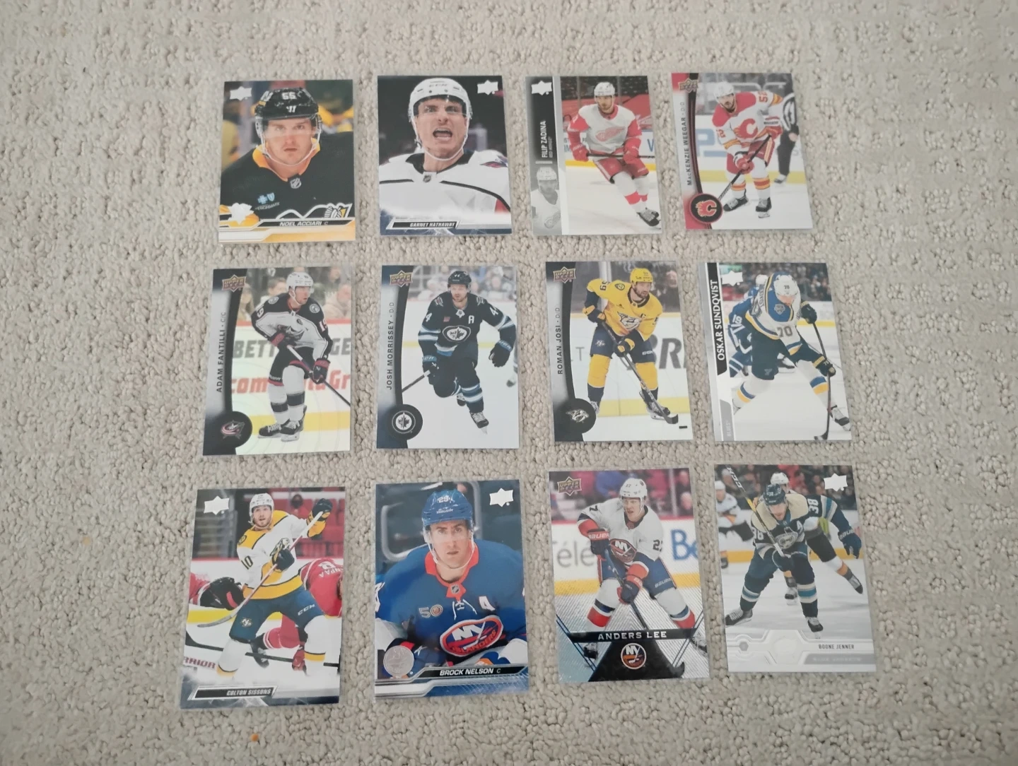 This collection includes 200 various Upper Deck and O-Pee-Chee modern and vintage NHL hockey cards, along with a few inserts from other brands, featuring multiple players and team affiliations. Cards shown include rookie cards, all-stars, and special inserts. It's a great mix for any hockey card enthusiast! Includes Logan Stankoven and Cutter Gauthier Young Gun checklist card too. The price is negotiable.