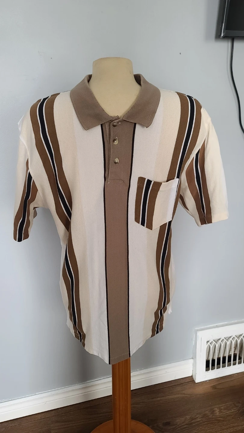 Selling a brown and white striped polo. Comes with a front pocket and has a comfortable relaxed fit. It’s a great basic shirt that goes with anything.