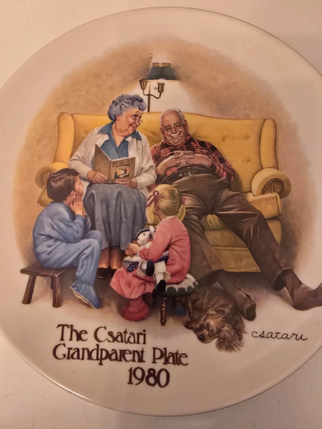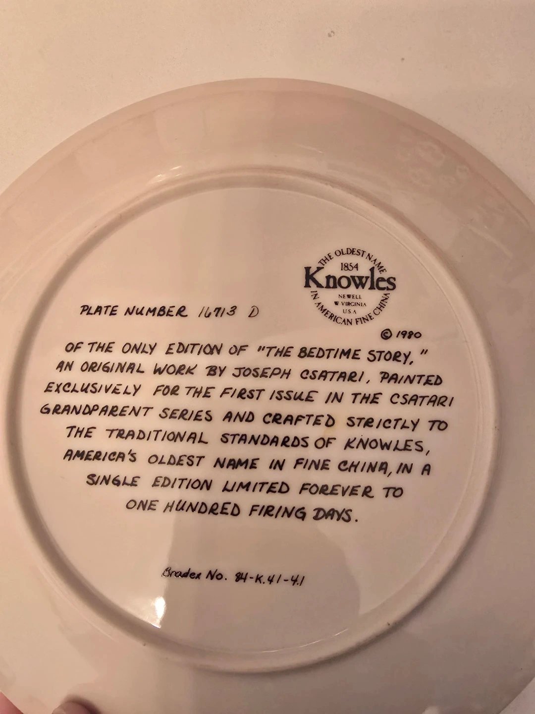 This is the first issue in the Csátari Grandparent Series, titled 'The Bedtime Story'. It's an original artwork by Joseph Csátari, crafted in fine china by Knowles. The plate is from the 1980 limited edition.