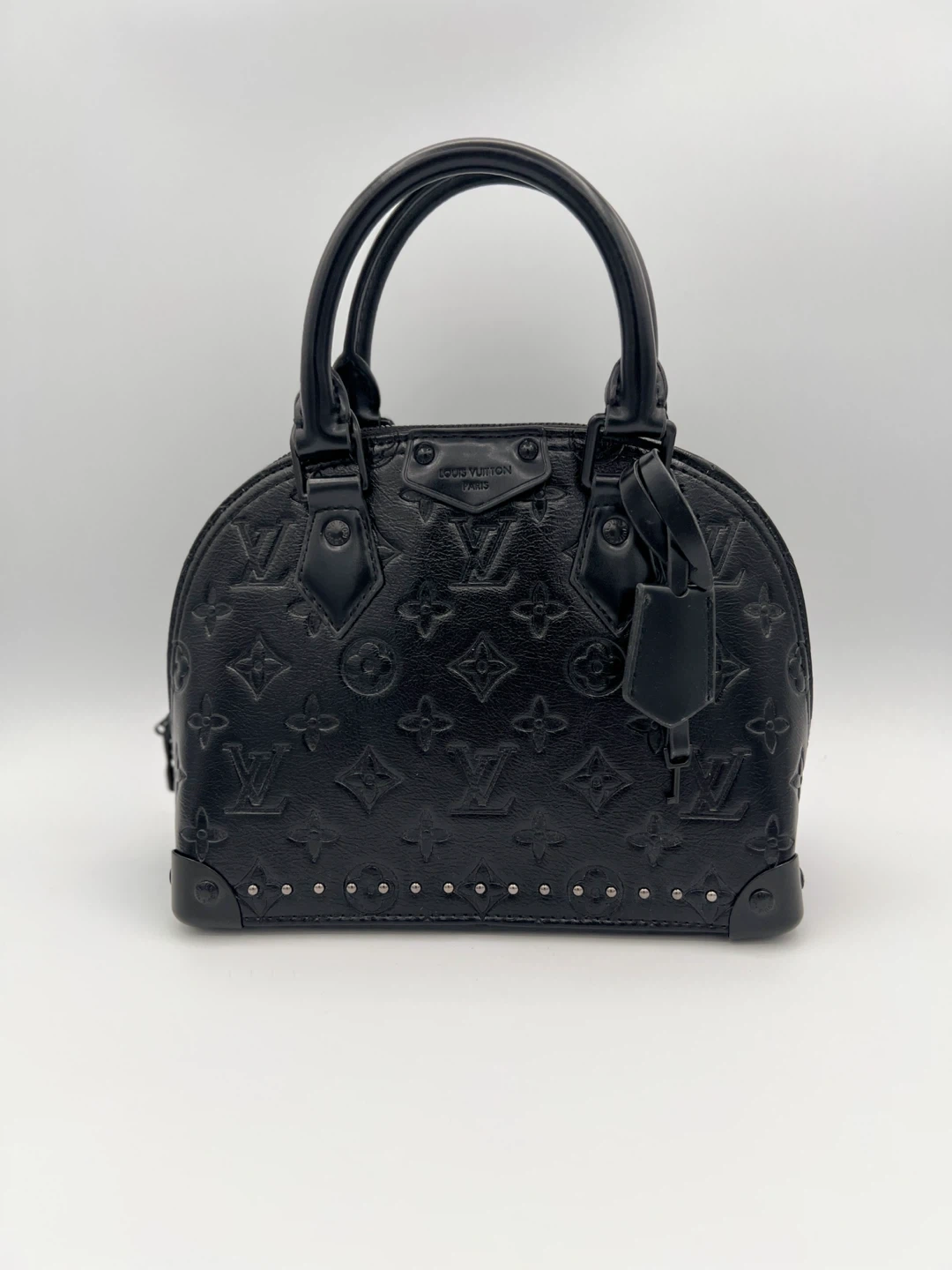 This is a black Louis Vuitton Alma Trunk BB handbag. It's made of embossed leather. The bag features the signature LV monogram pattern. Black on black.