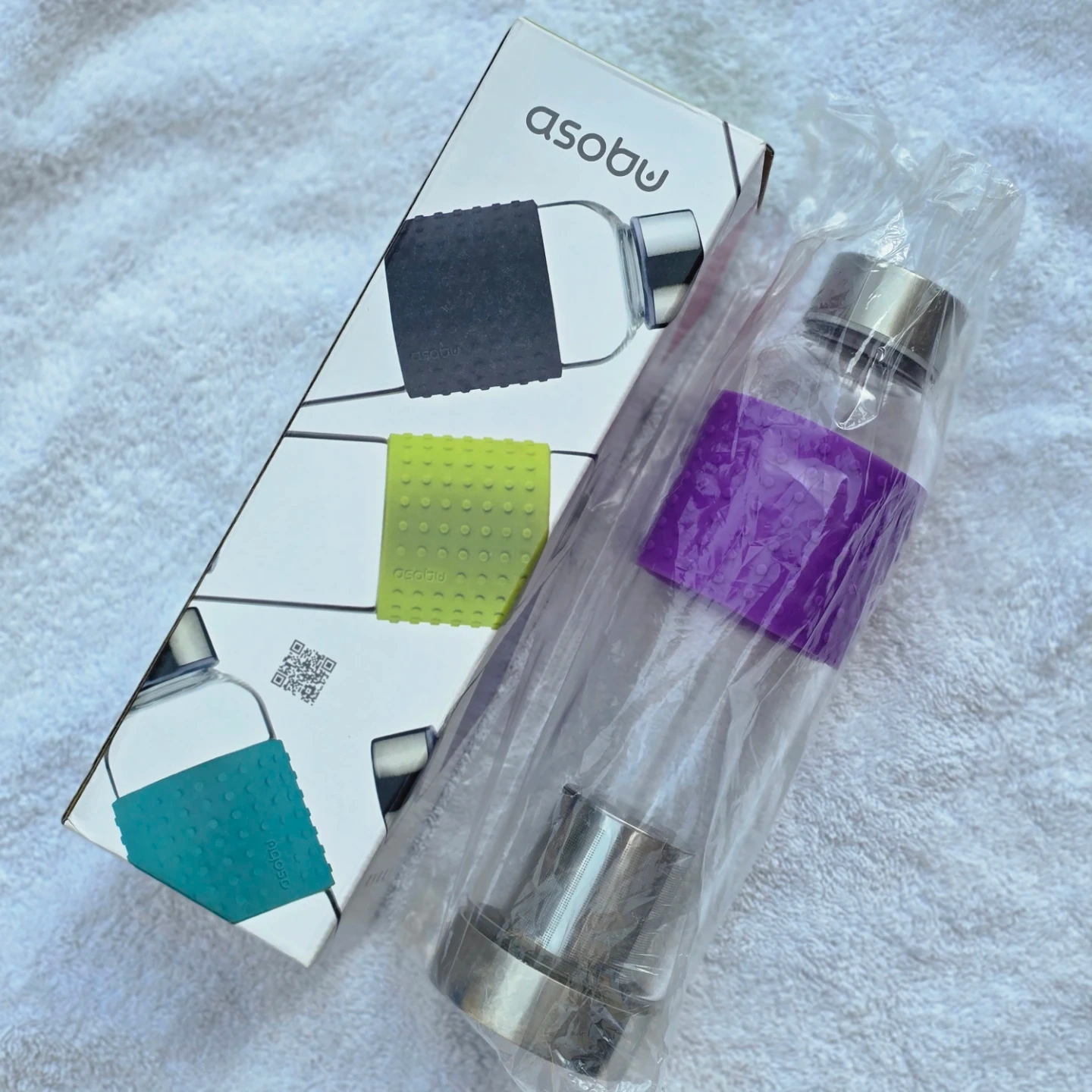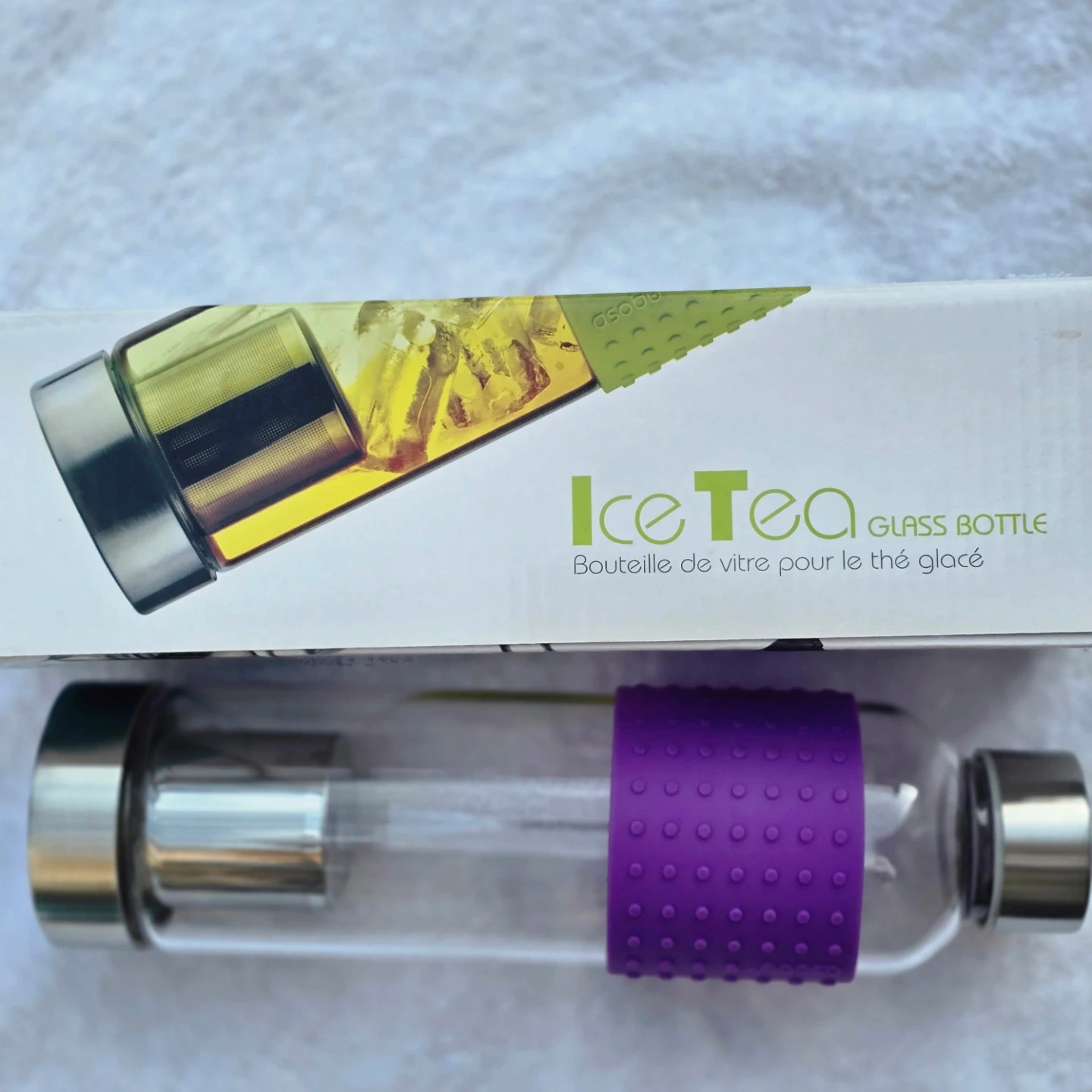 *NEW in box. INFUSER BOTTLE Original Asobu Ice2go 14 ounce Glass water bottle that comes with a stainless steel infuser to put medium Coffee grinds or loose leaf Tea.