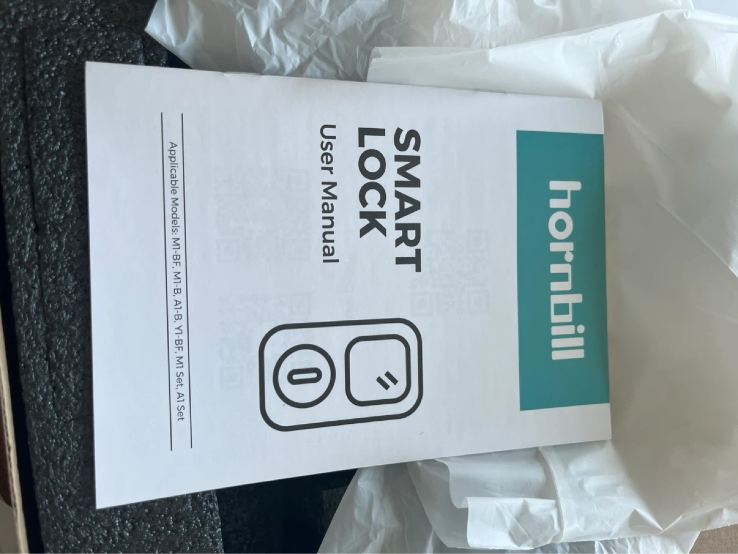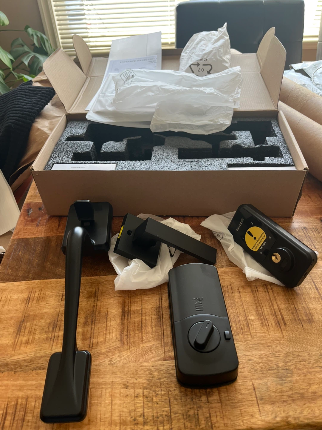 Brand New Hornbill smart deadbolt lock and handle set in matte black. It's a keyless entry system with touchscreen keypad and app Bluetooth control. Includes original box and user manual.