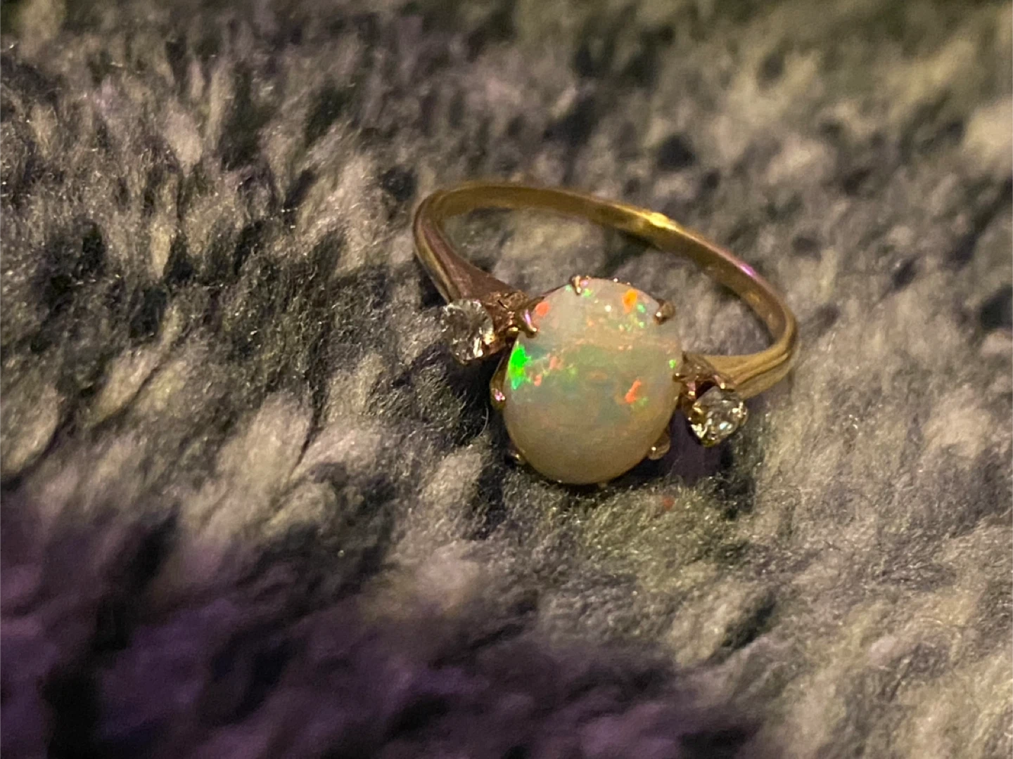 Selling a beautiful opal gemstone 10 karat 1.6 gram gold ring. The ring features a lovely opal stone with smaller accent stones on a gold band. It's in great condition and would make a wonderful addition to any jewelry collection!