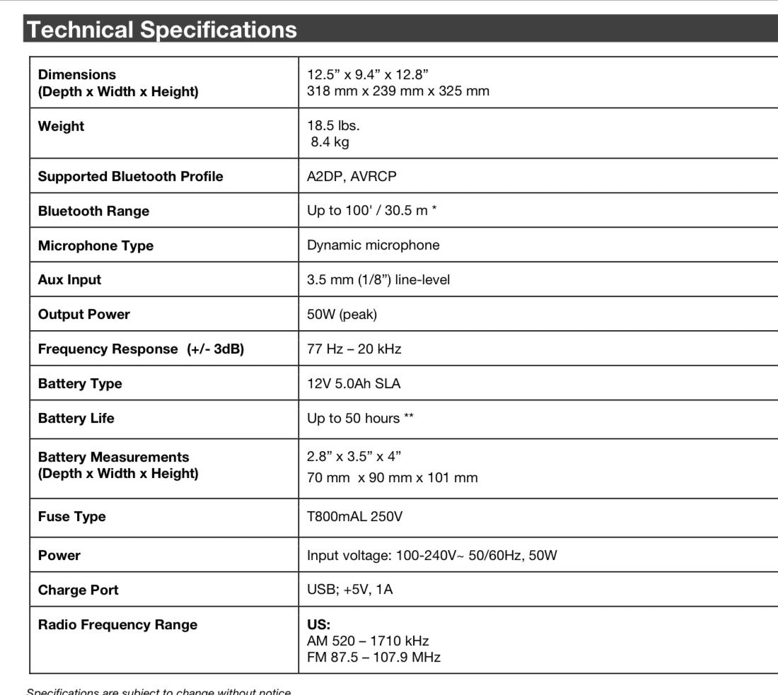 This ION Tailgater Flash (IPA88) is a 50-watt portable Bluetooth speaker with a rechargeable battery, a 2-way speaker system, and a sound-reactive light show. It features wireless Bluetooth streaming up to 100 feet, an AM/FM tuner, an auxiliary input, and a USB charging port. The built-in battery provides up to 50 hours of use on a single charge. It has a 2-way speaker system with a woofer and a wide-dispersion tweeter. Wireless connectivity includes Bluetooth streaming with up to 100 ft range and NFC pairing. Wired connection is via a 3.5mm auxiliary input. It includes a 1/4" microphone input with volume control and a microphone. There's a USB port for charging devices and a separate USB port for music playback. The speaker has sound-reactive LED lighting with multiple display modes and a built-in AM/FM radio. It's portable with a built-in handle. Onboard controls manage master volume, radio, and light modes. The speaker delivers great sound and a dynamic light show. You can stream music from any Bluetooth device, enjoy the built-in AM/FM radio, or use the included microphone. It also functions as a USB power bank to recharge your devices. Dimensions are 12.5" x 9.4" x 12.8" and it weighs 18.5 lbs.