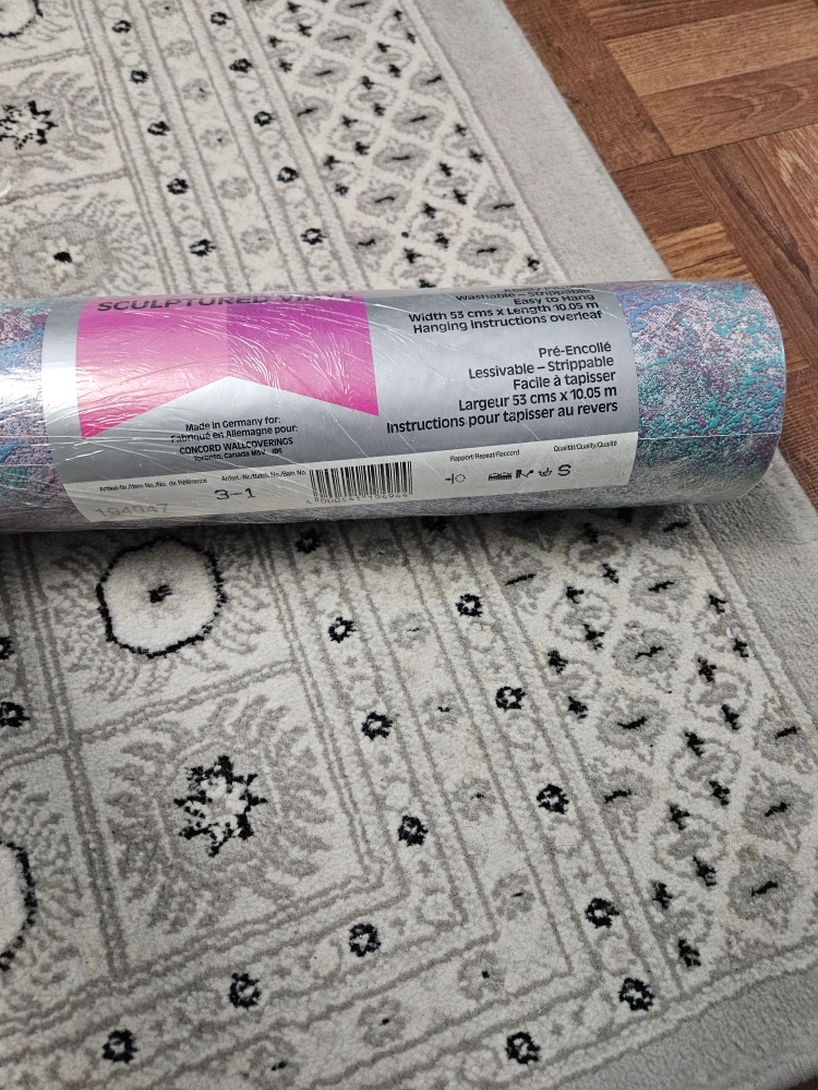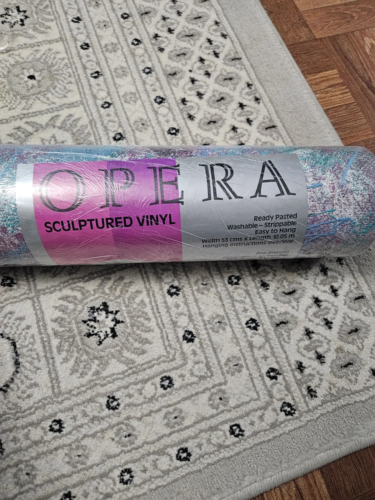 Selling a roll of Opera Sculptured Vinyl wallpaper. washable, and easy to hang. The dimensions are 53 cm x 10.05 m. Perfect for adding a touch of elegance