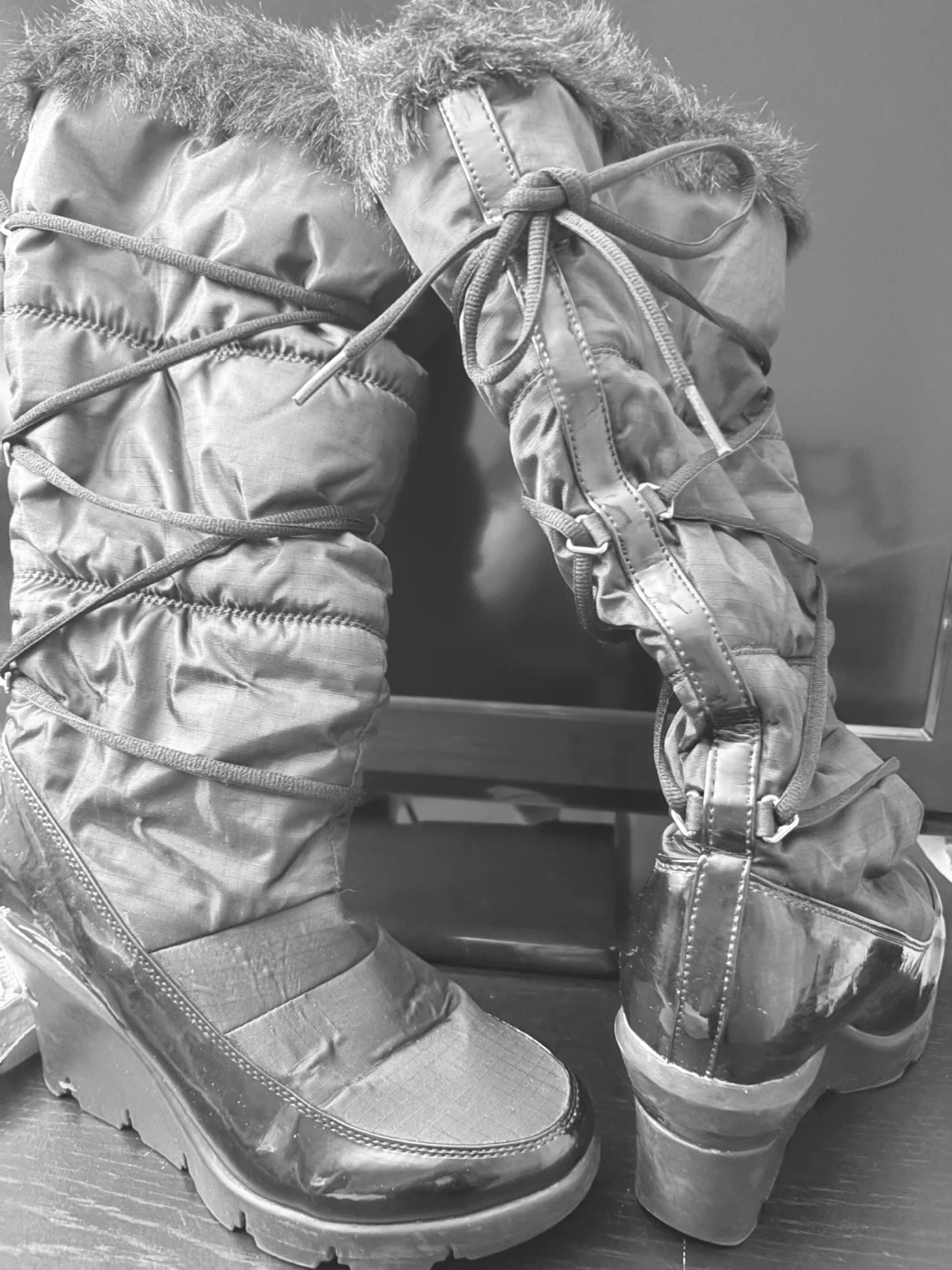 Tall black puffer boots featuring a comfortable wedge heel and cozy faux fur trim. These boots have a shiny patent toe cap and detailing, with adjustable criss-cross lacing up the back for a custom fit. They're perfect for staying warm and stylish on chilly days!