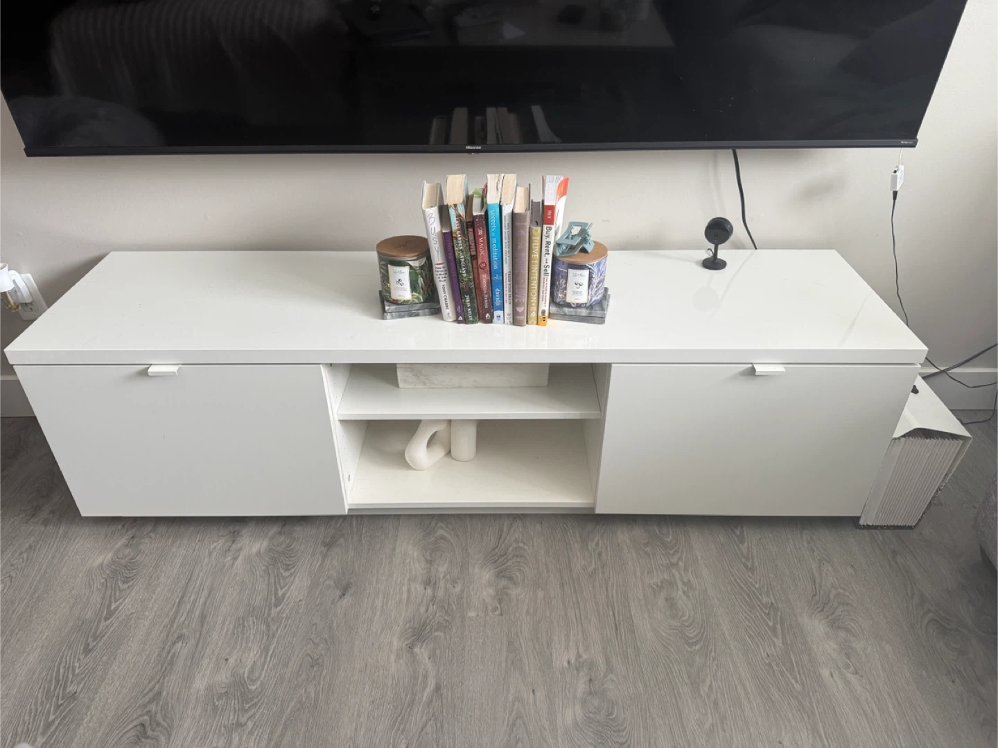 This white media console features two cabinets and an open shelf. It's perfect for storing electronics or displaying decor. The clean design complements any living space.