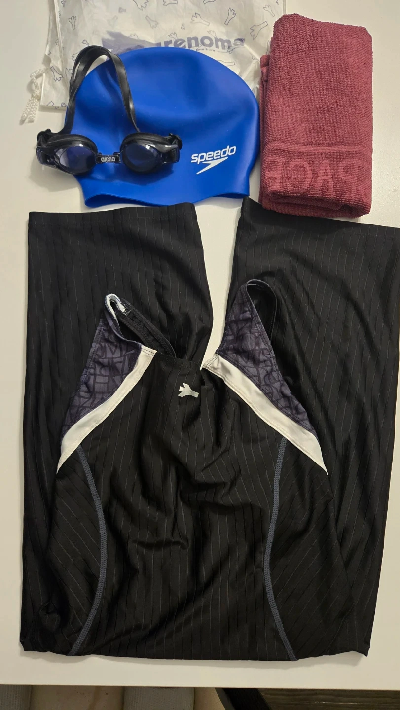This bundle includes an Arena black swimsuit with pinstripe detailing and an Arena branded swim cap. A Speedo swim cap and goggles are also included, along with a pink towel. Comes with a Renoma drawstring bag.