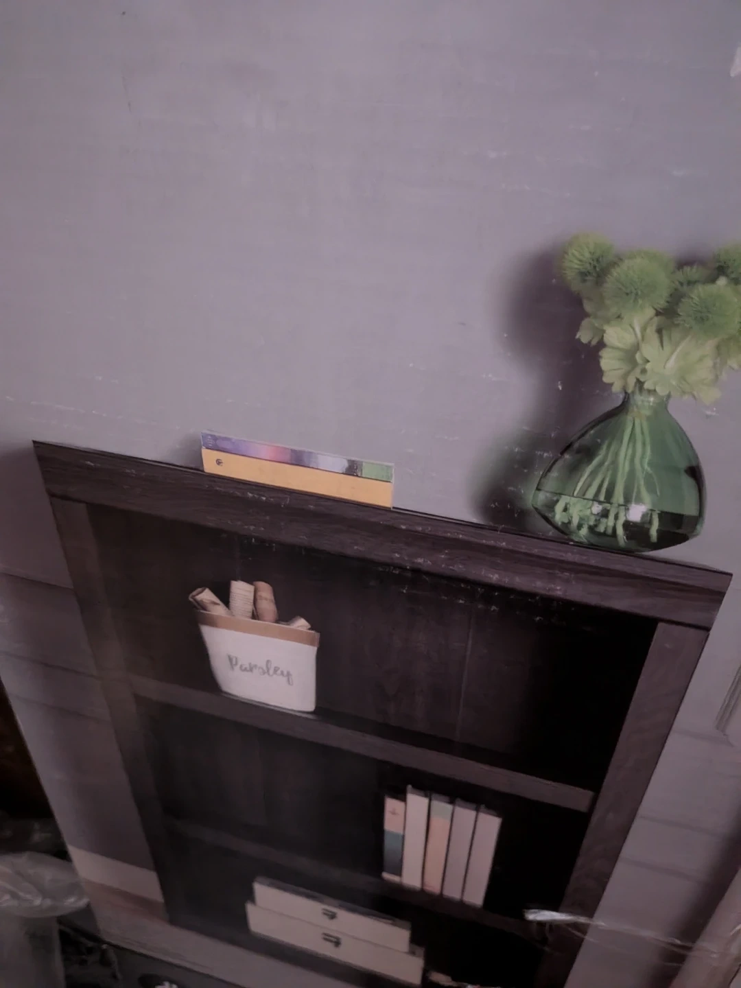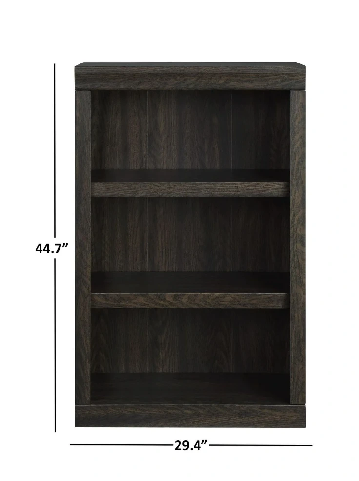 This Hometrends bookcase has three shelves and a dark oak finish. It measures 44.7 inches high, 29.4 inches wide, and 13 inches deep. This unit is made in China.