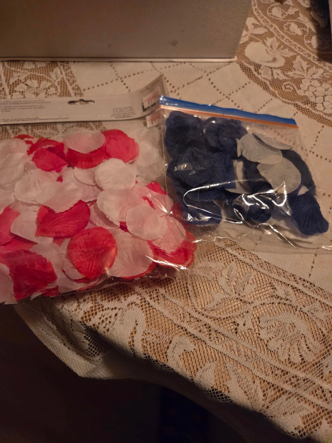 🏆A bulk set of artificial flower petals in red, pink, white, and blue. These fabric petals are ideal for crafts, decorations, or special events. They come in separate bags for easy organization.