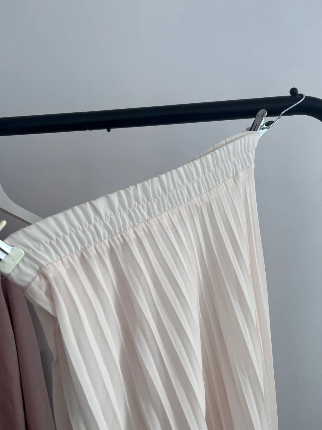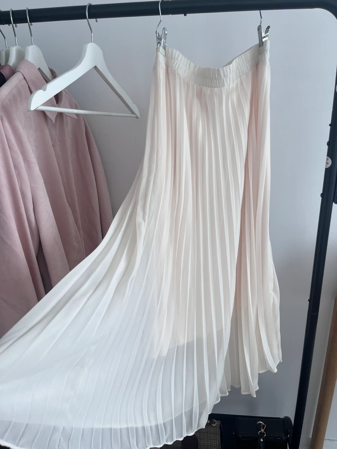 This is a cream-coloured pleated midi skirt. It features an elastic waistband for comfort. The skirt is made from a lightweight, flowing fabric. Purchased in South Korea. (Click other listings- Moving country sale - every clothes and handbags under $10)
