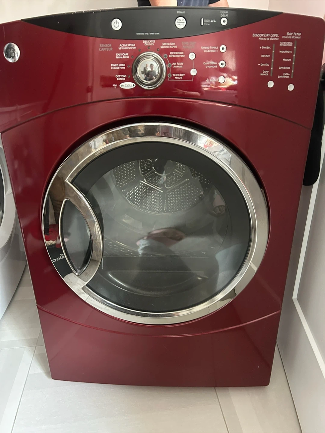 This is a red electric dryer from GE. It has sensor dry levels and multiple temperature settings. It also includes various cycles like Active Wear, Delicates, and Speed Dry. It's a great appliance for your laundry needs!