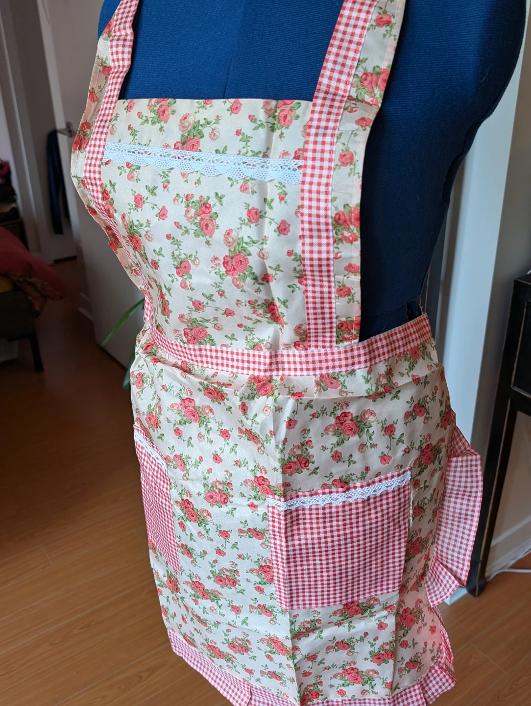 Floral Apron with Red Gingham Pockets, new