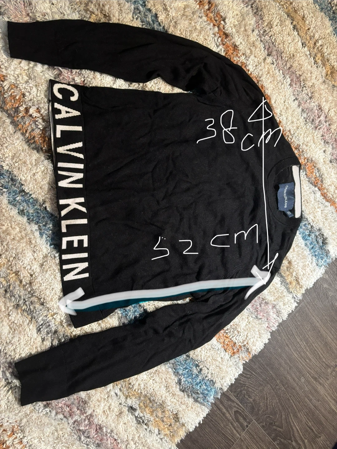 Selling a Calvin Klein Jeans sweater in black! It's a size small. The measurements are approximately 38 cm across the shoulders and 52 cm in length. It's in great condition and ready for a new home!