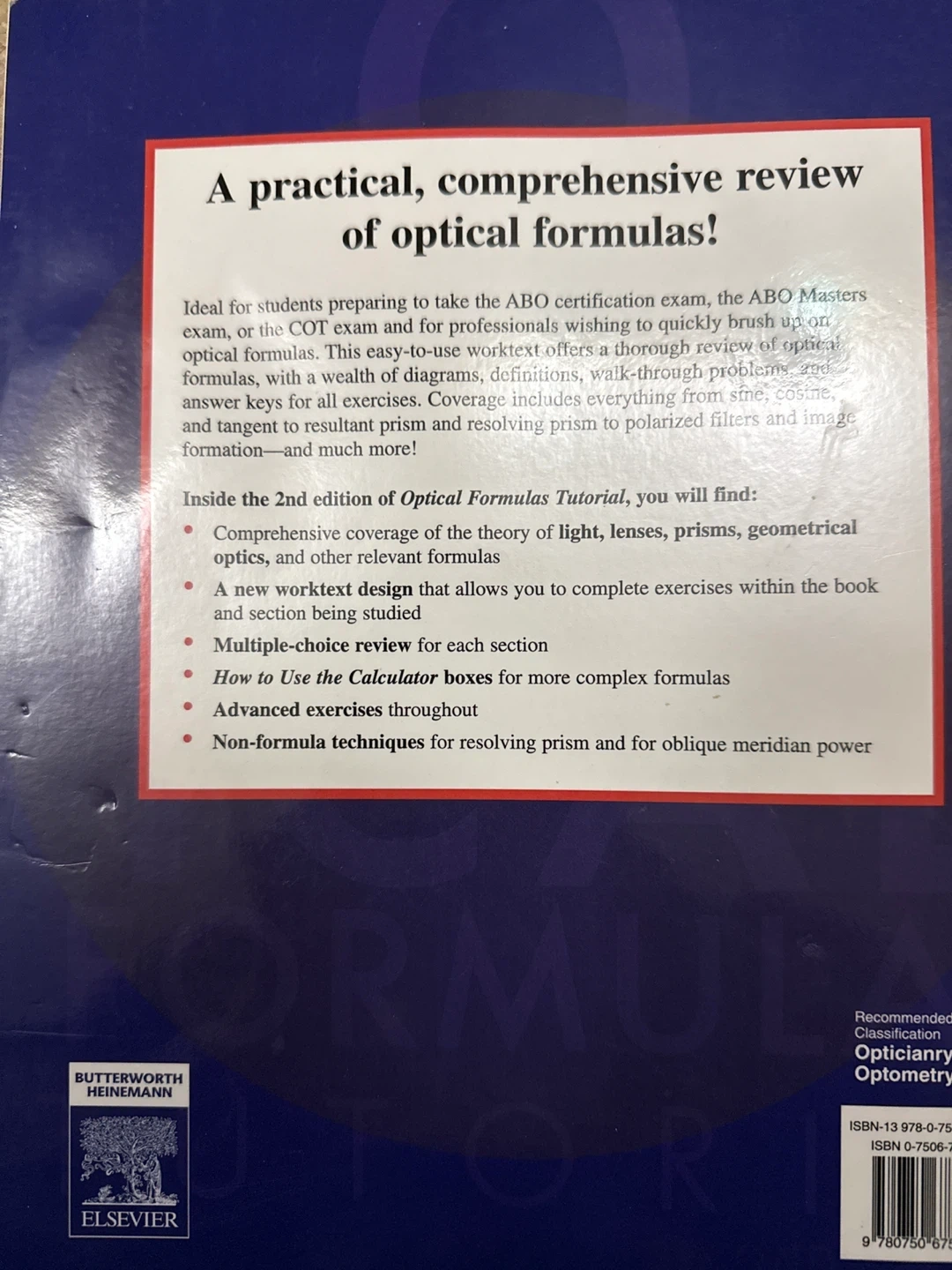 10Selling "Optical Formulas Tutorial, Second Edition" by Ellen Stoner, Patricia Perkins, and Roy Ferguson. A practical, comprehensive review of optical formulas! Ideal for students preparing to take the ABO certification exam, the ABO Masters exam, or the COT exam and for professionals wishing to quickly brush up on optical formulas. This easy-to-use worktext offers a thorough review of optical formulas, with a wealth of diagrams, definitions, walk-through problems, and answer keys for all exercises