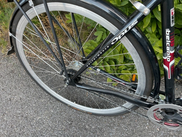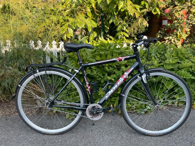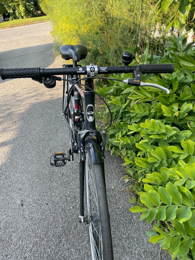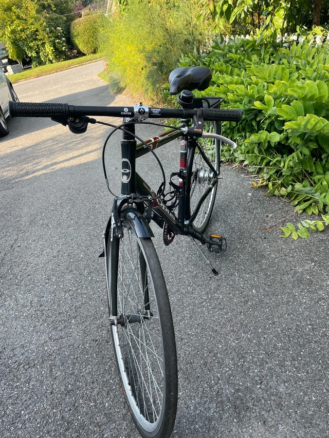 If the ads still on, it's available. Beautiful made Canadian quality bike great for commute comes with mudguards and panniers rack and kick stand, low maintenance 4 speed coaster brake great for wet, carbon forks, wide narrow chainring, new puncture guard tires, plush rubber suspension saddle. size 52 for 5'5-5'8 ish Ready to roll