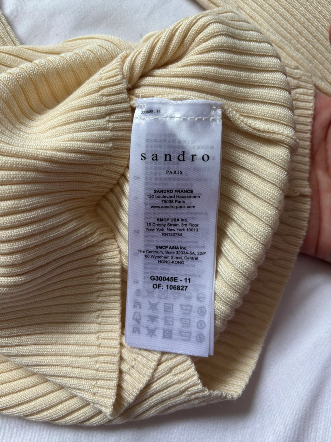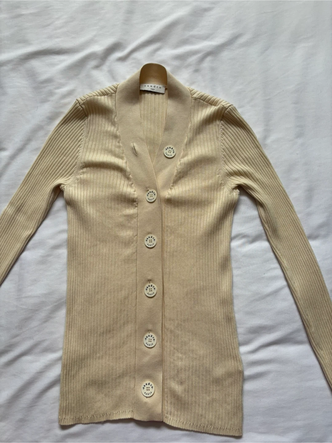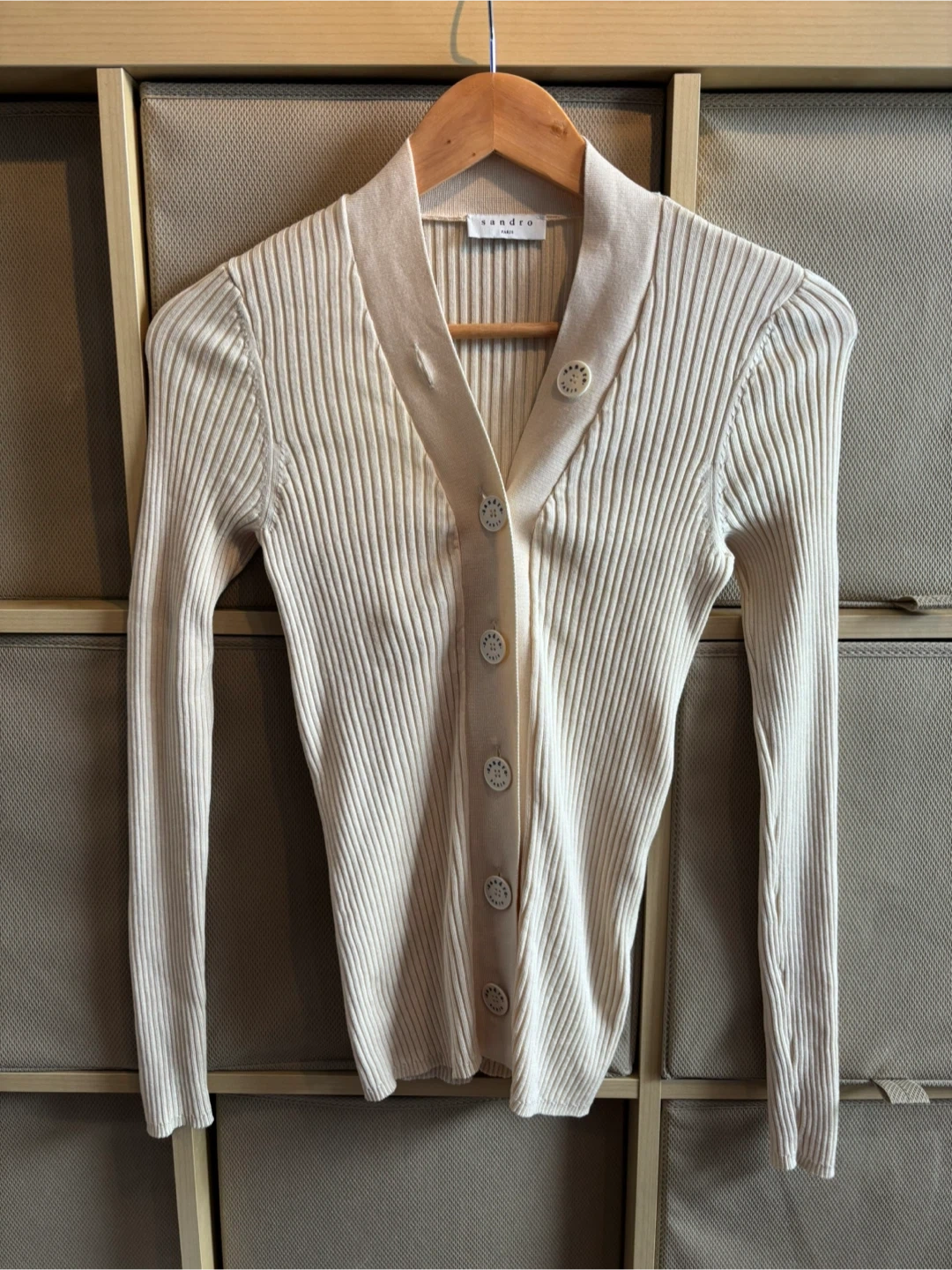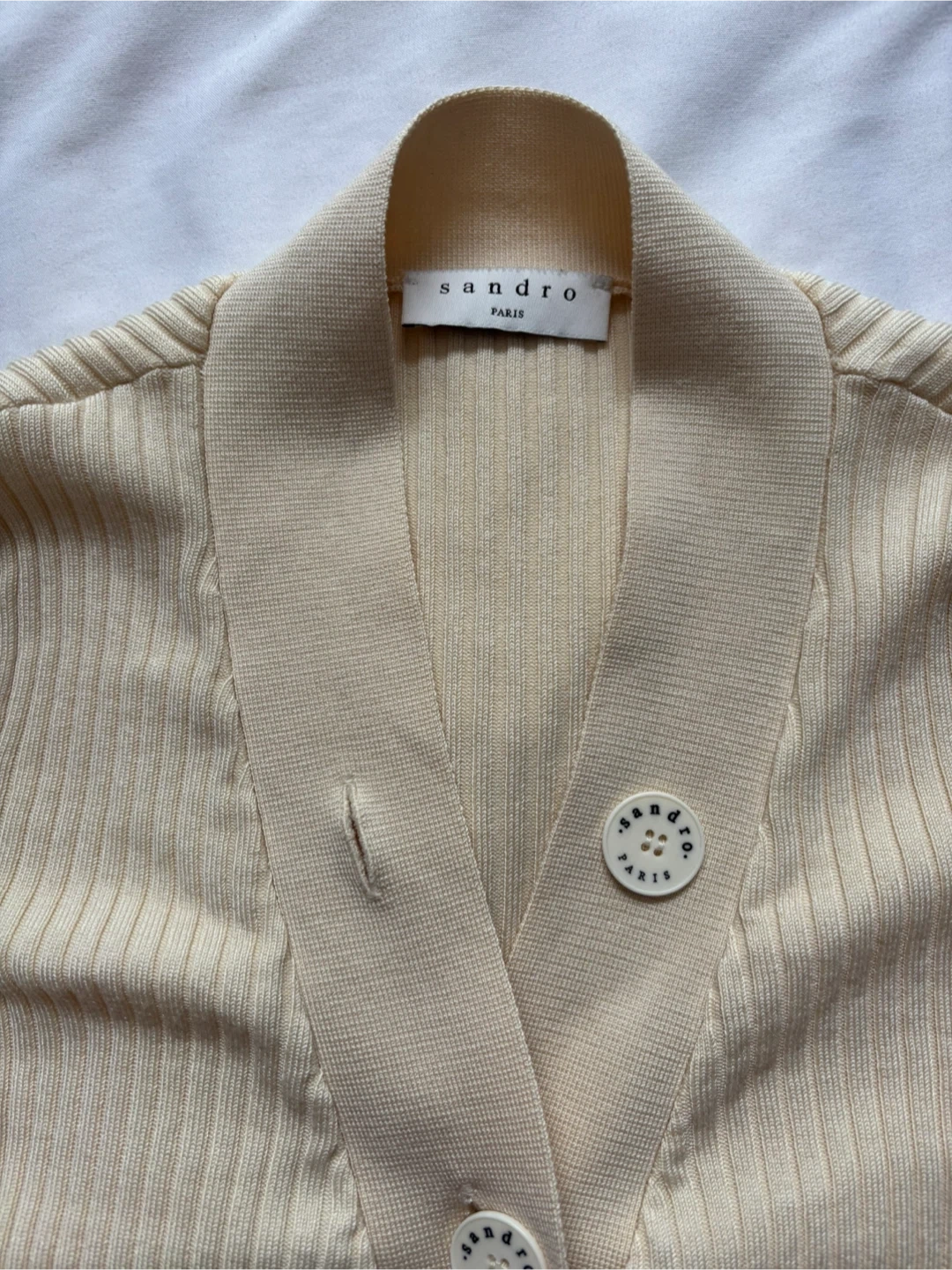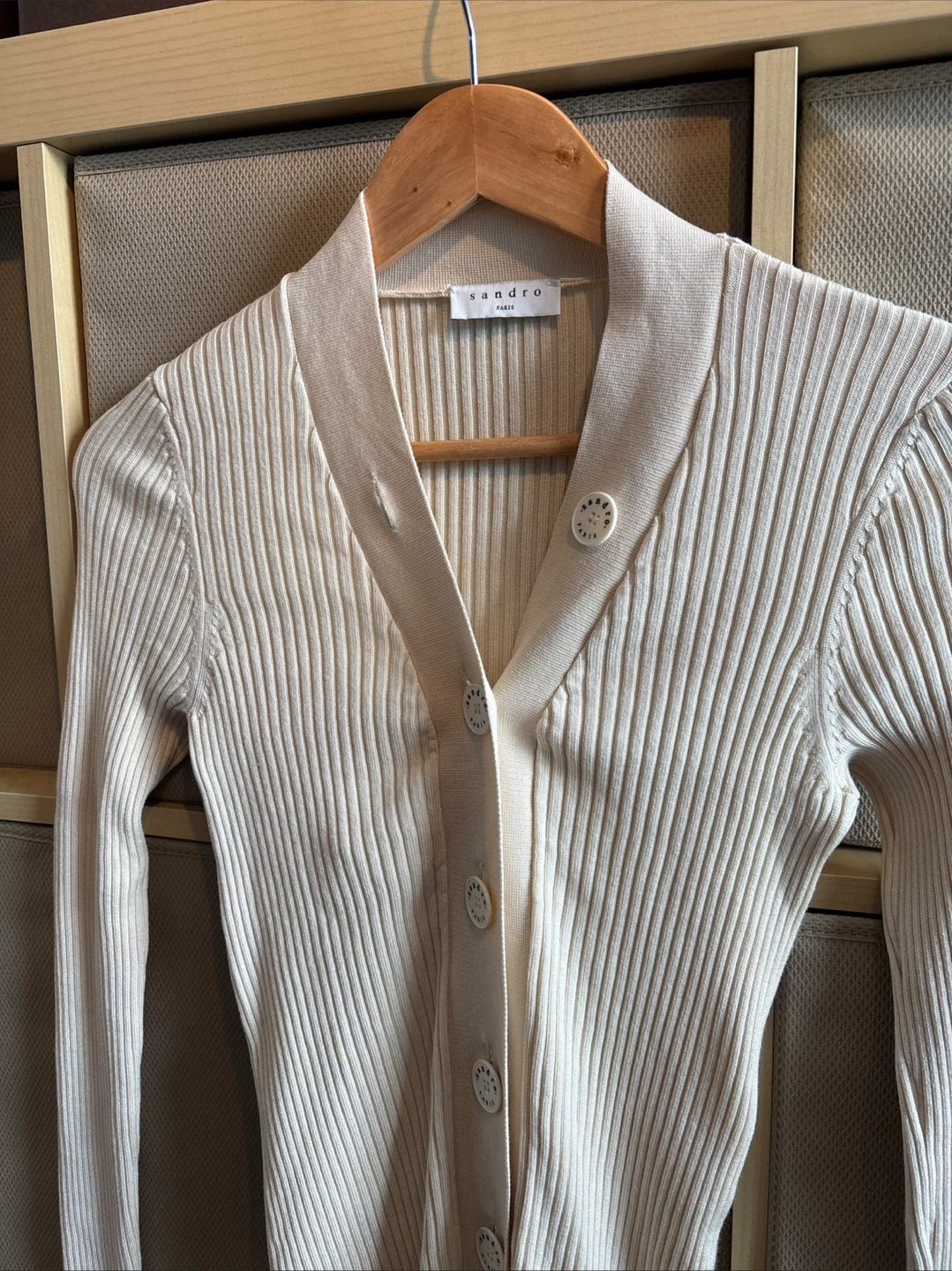 This is a cream-coloured ribbed knit cardigan from Sandro. It features a V-neckline with button-up closure and decorative buttons. The material is soft and stretchy, perfect for layering.
