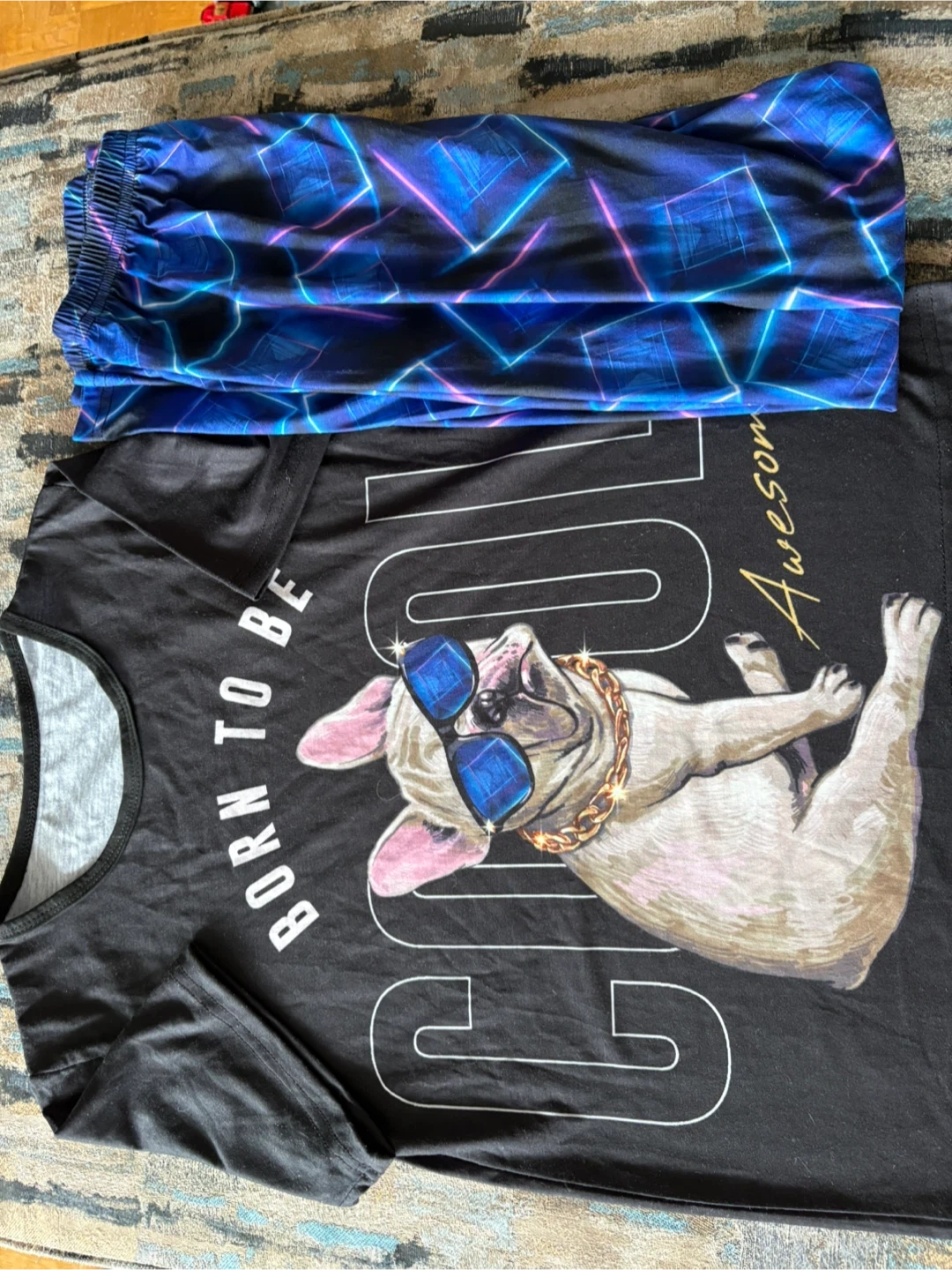 Comfortable pajama set featuring a cool French bulldog graphic on the shirt and geometric neon pattern on the pants. The shirt says 'BORN TO BE COOL'. Great for lounging!