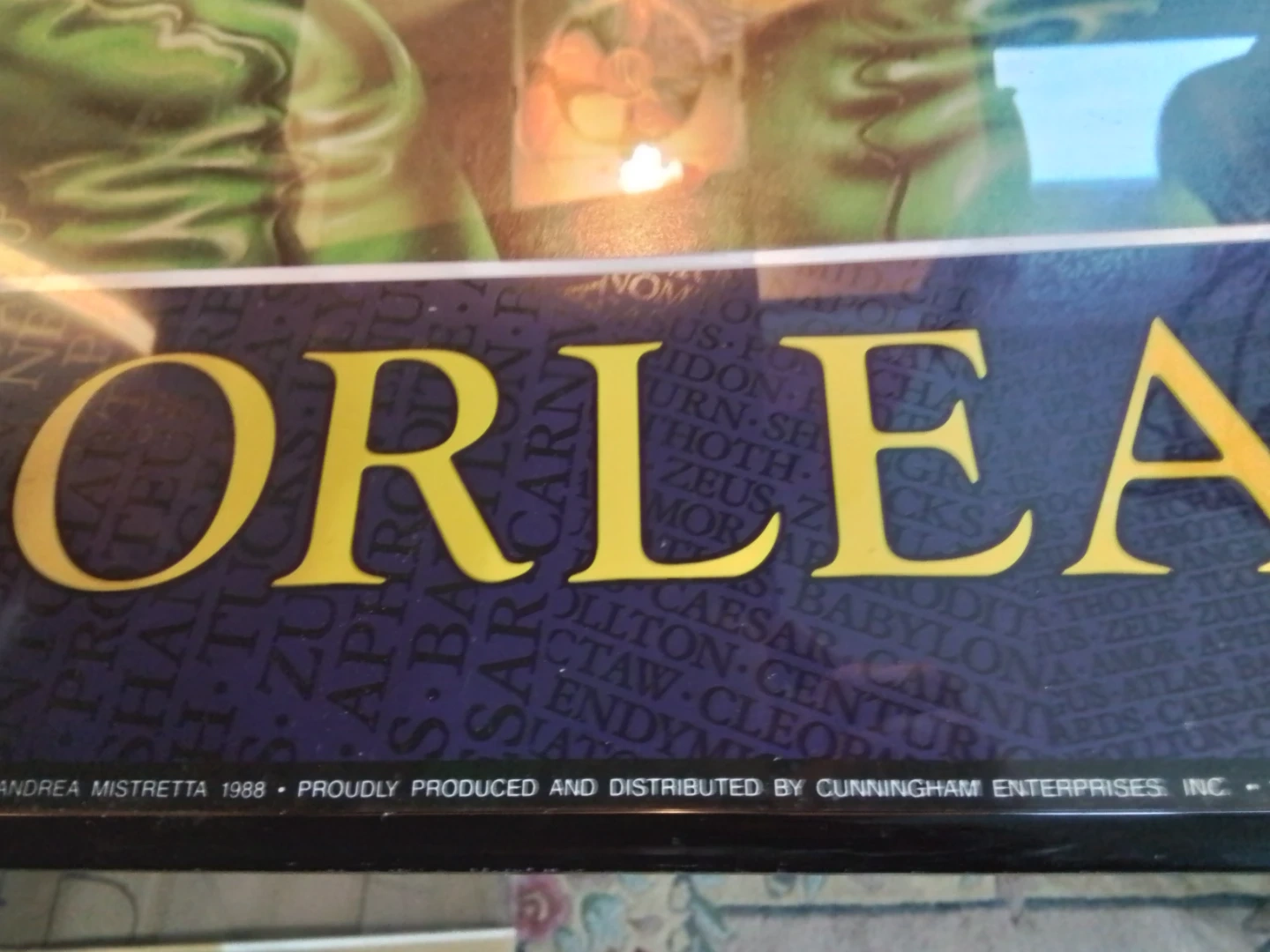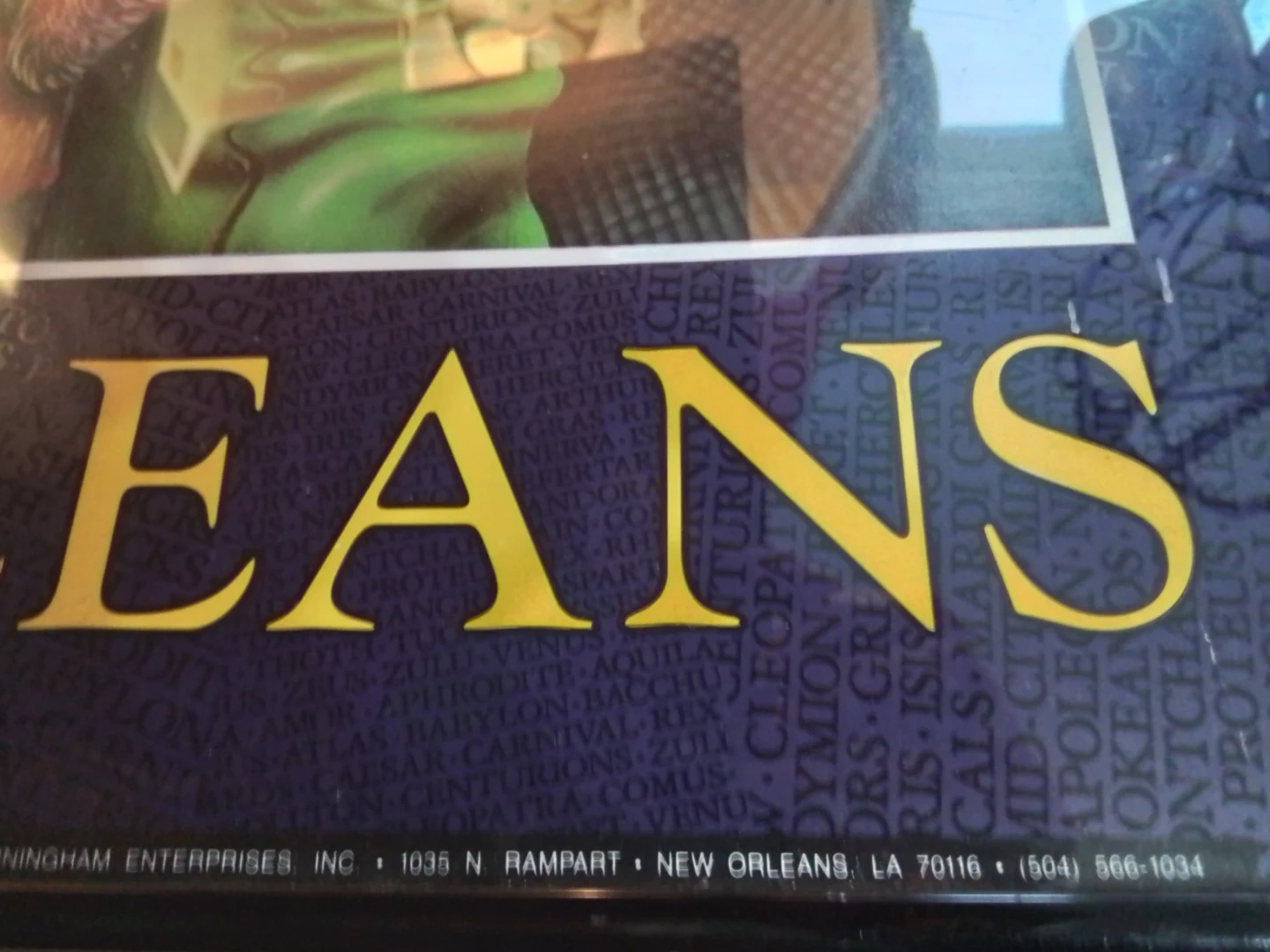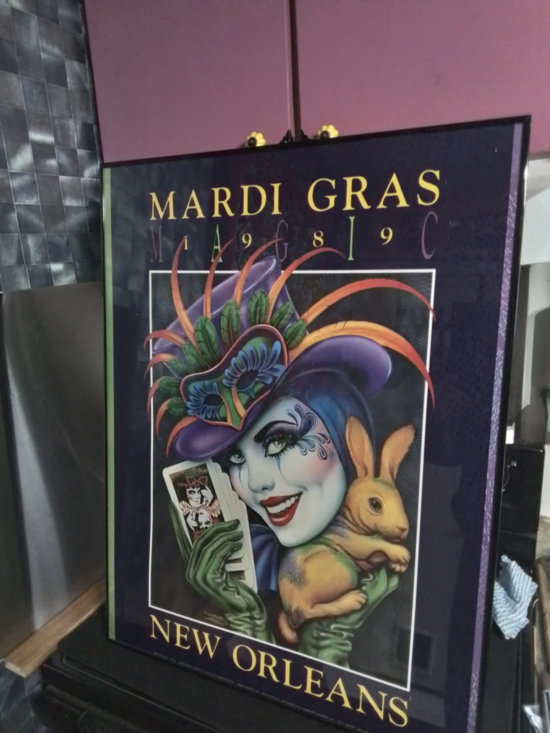 This vintage Mardi Gras New Orleans framed poster, measuring 24.5 x 32 inches, captures the vibrant essence of the 1989 celebration. The artwork features a captivating lady holding a rabbit with a backdrop that's rich in Mardi Gras flair.