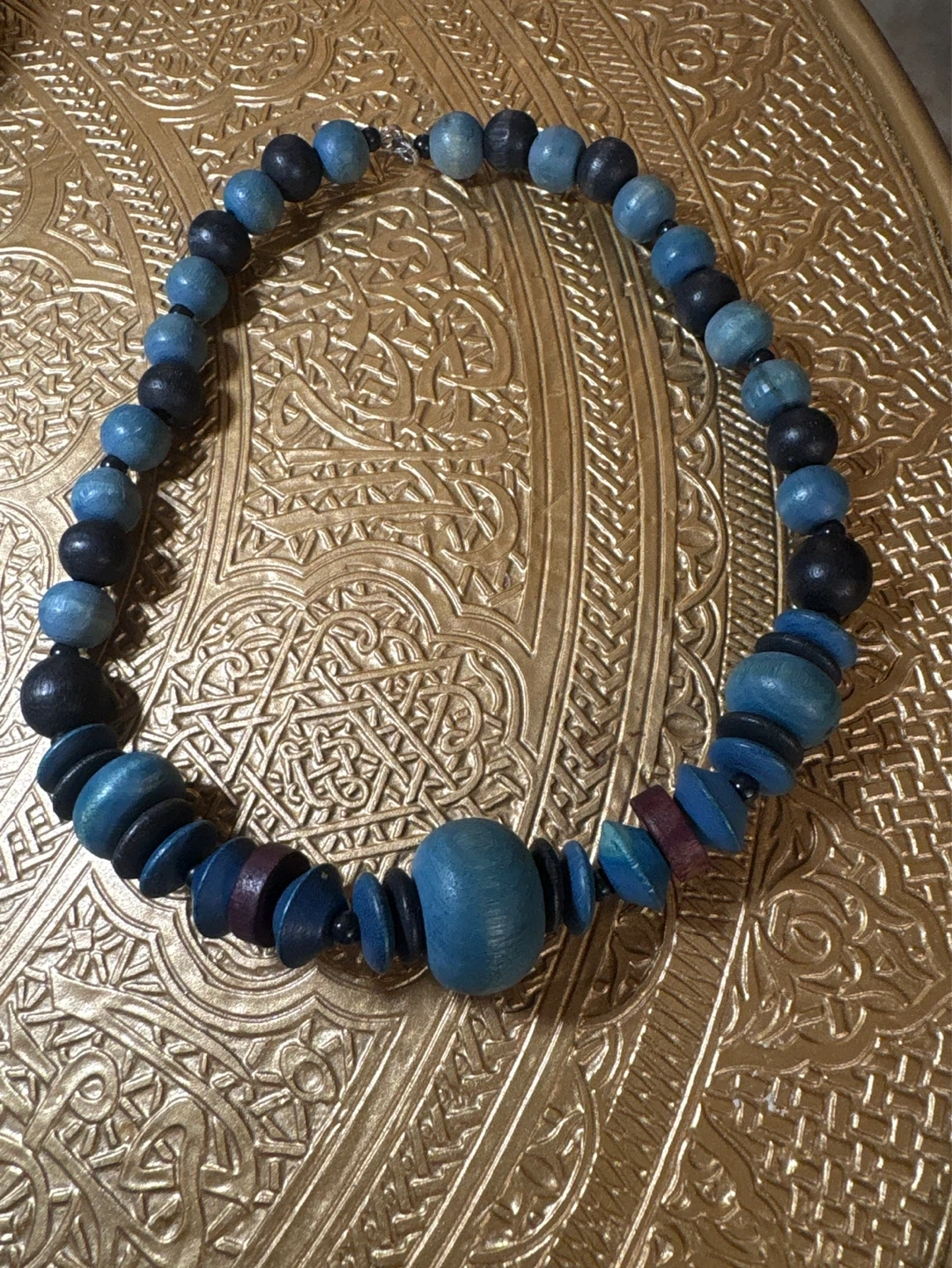 A colourful necklace with various blue and black wood beads, including a large centre bead. It's strung together with a secure clasp. This necklace offers a unique, handcrafted look.