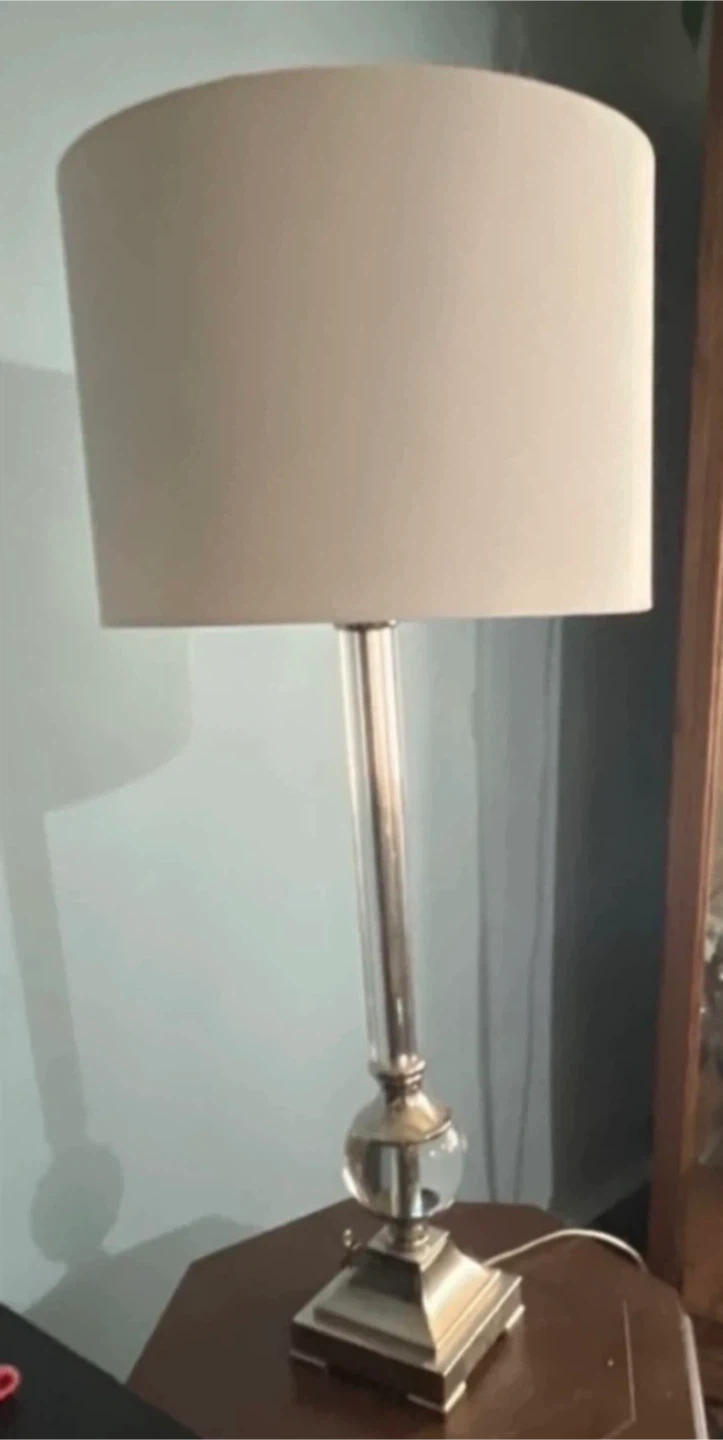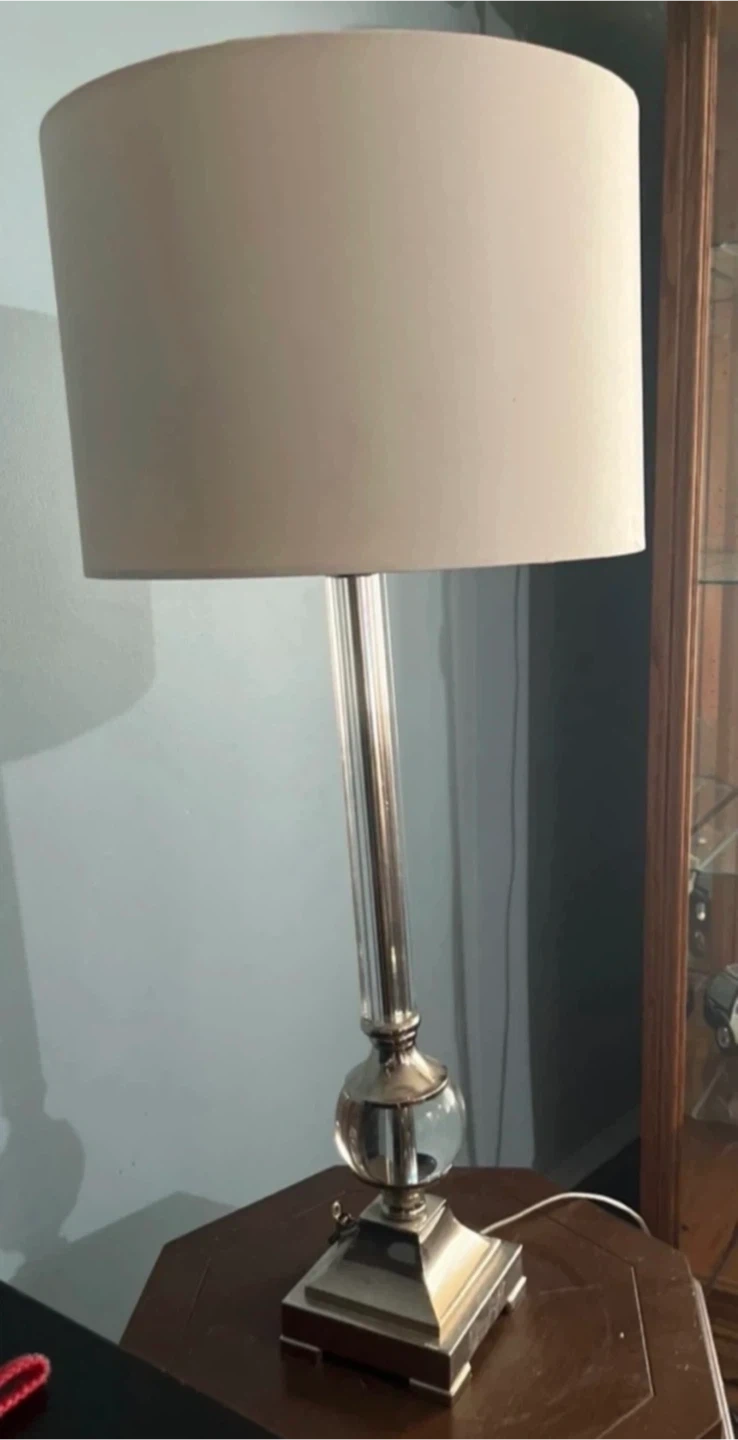 Large elegant crystal table lamp with off-white shade. It features a clear crystal glass column and a square base. It would be a great addition to a living room, dining room, or bedroom. Excellent condition. From smoke-free, pest-free, and pet-free home.