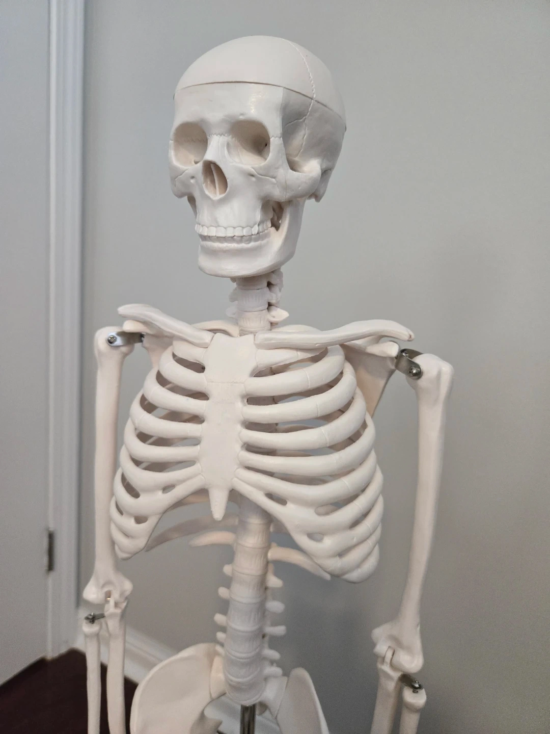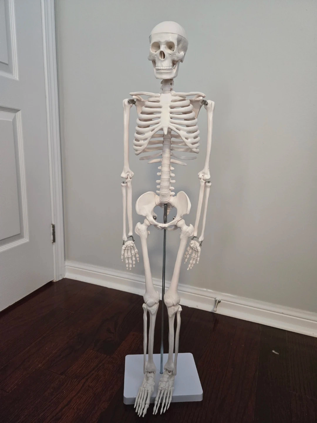 This is a human skeleton model, great for educational purposes. It's made of durable plastic and includes a metal stand for display. The model is around 3 feet tall. I used it for my anatomy class and it really helped as the bones rotate to mimic actions.
