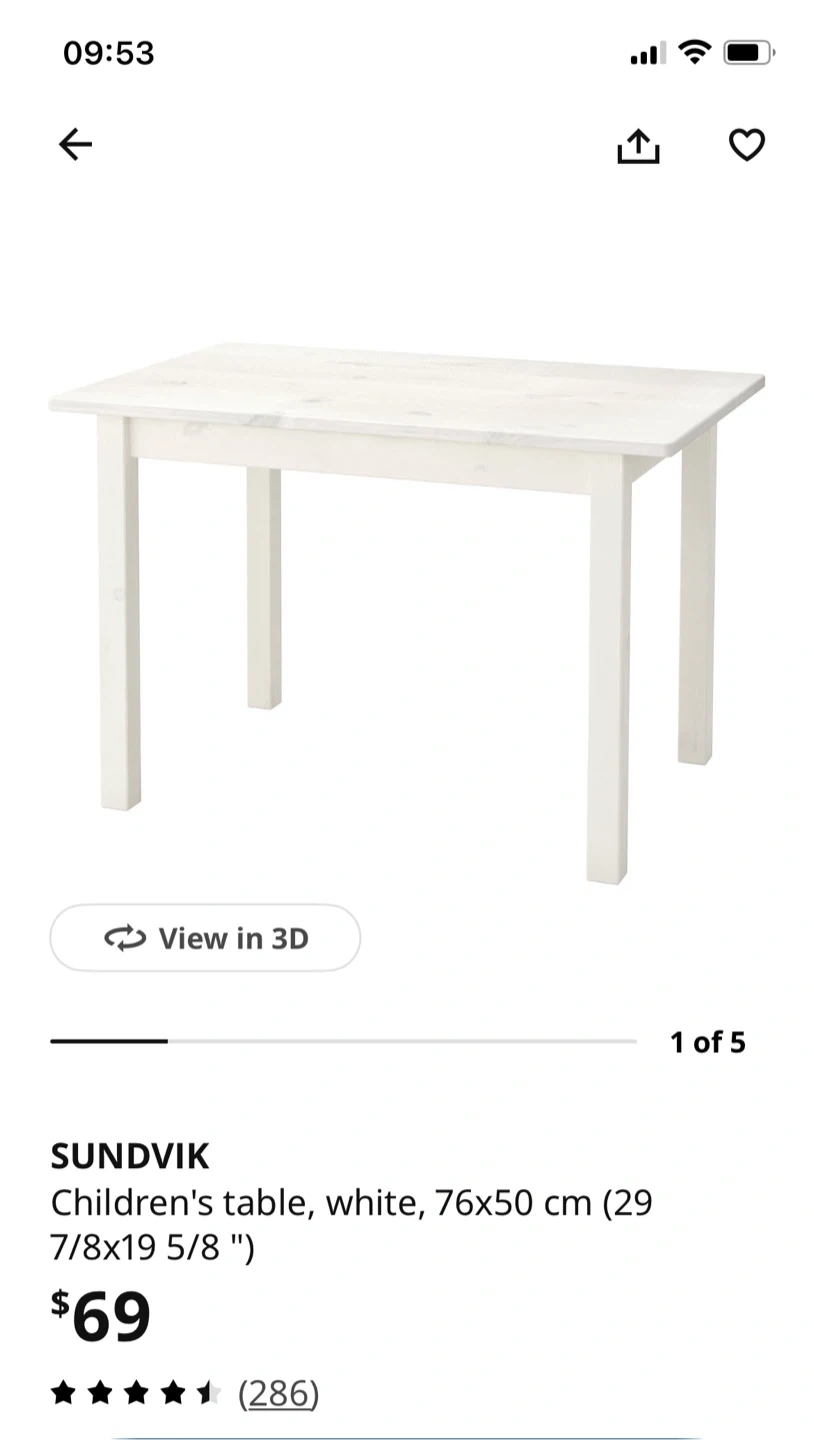 This is the IKEA SUNDVIK children's table. It's white and measures 76x50 cm (29 7/8 x 19 5/8 "). It's a good size for little ones to use for drawing or playing.