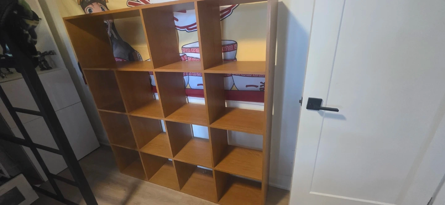 This is a 16-cube shelving unit with a wood-like finish. It's great for organizing books, decor, or other items. It's a versatile piece for any room!