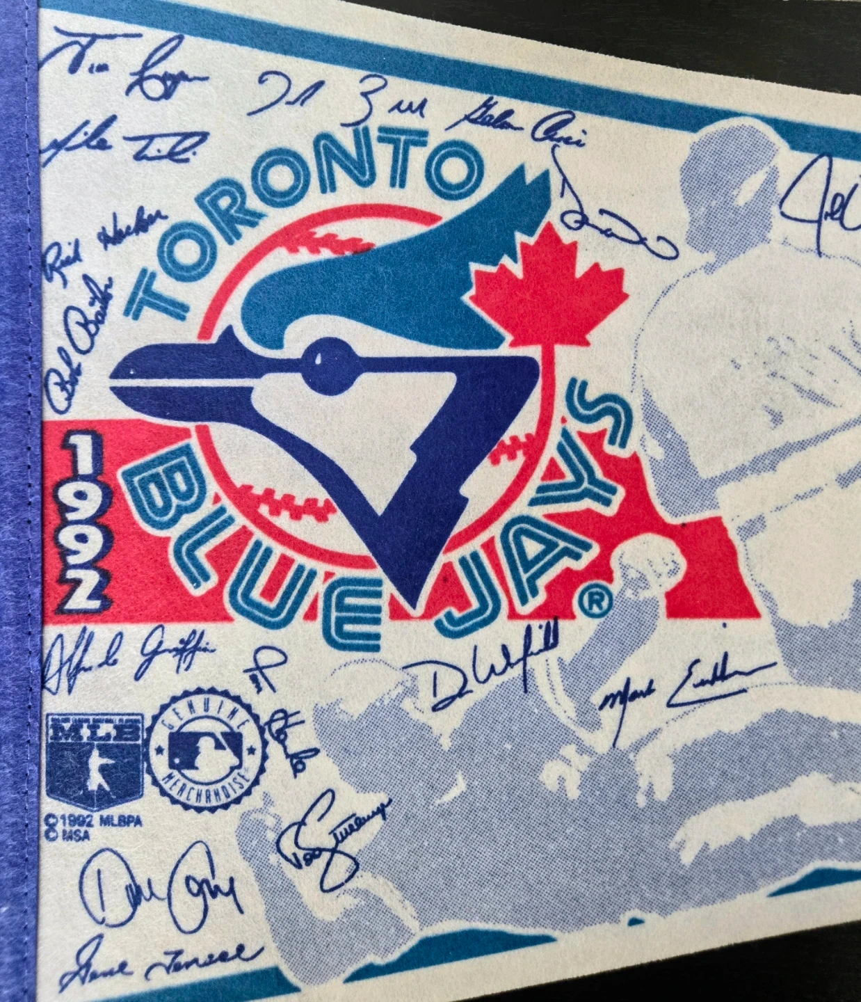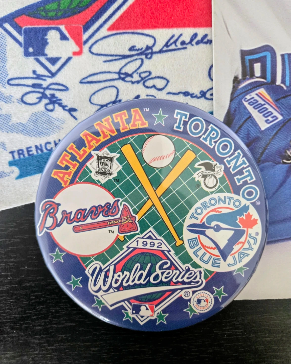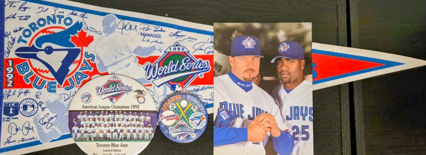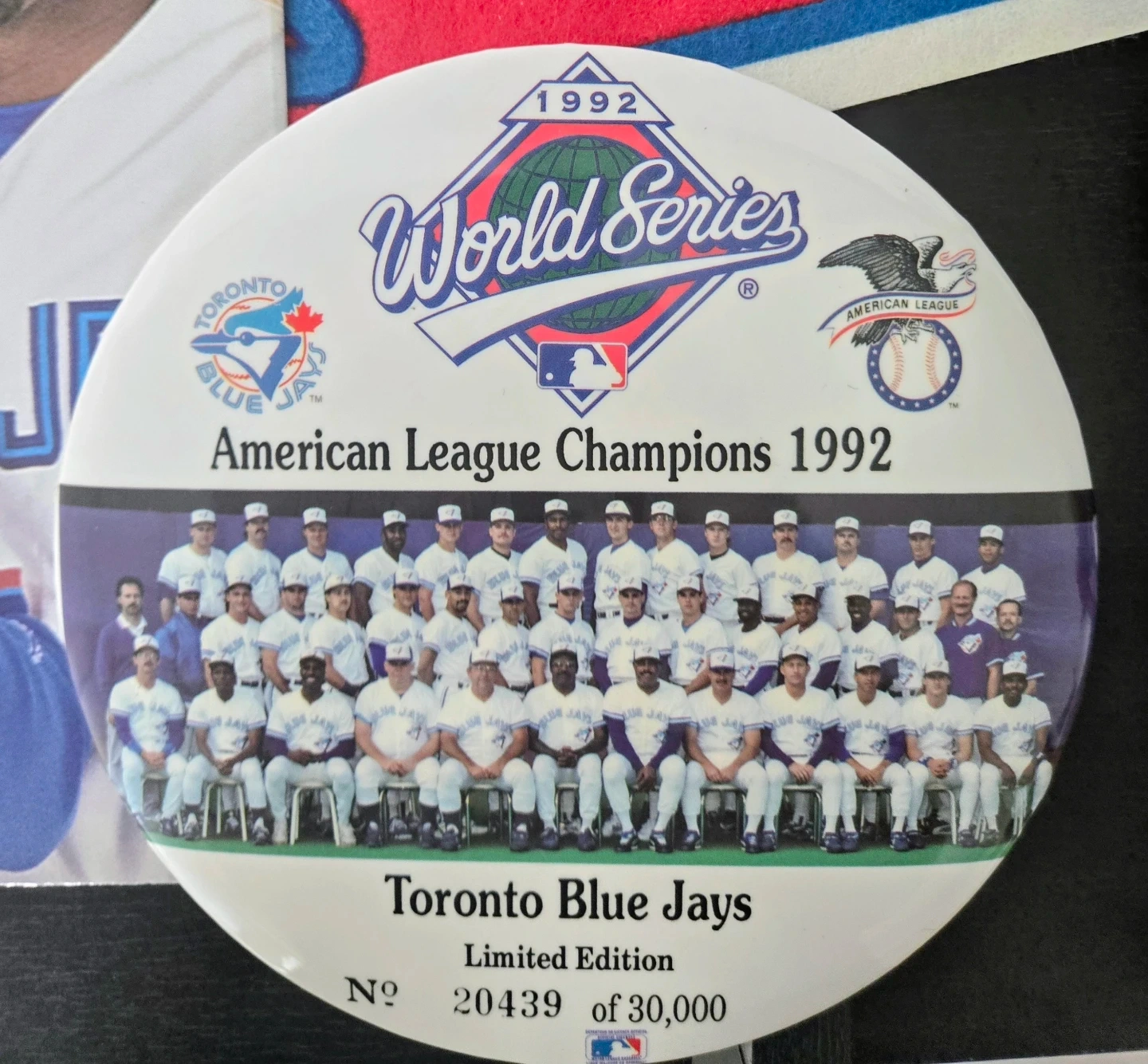 Im Selling a Collection of vintage Blue Jay Memorabilia that Includes 1992 World Series/American League Champions Pennant, 2 World Series Buttons, one is a 6" limited edition. Also includes a Rare 1997 Promotional Poster with Roger Clemens and Carlos Delgado. New Condition, Never Displayed, factory folded. All Memorabilia is in Excellent Vintage Condition. ASKING $35 FIRM.