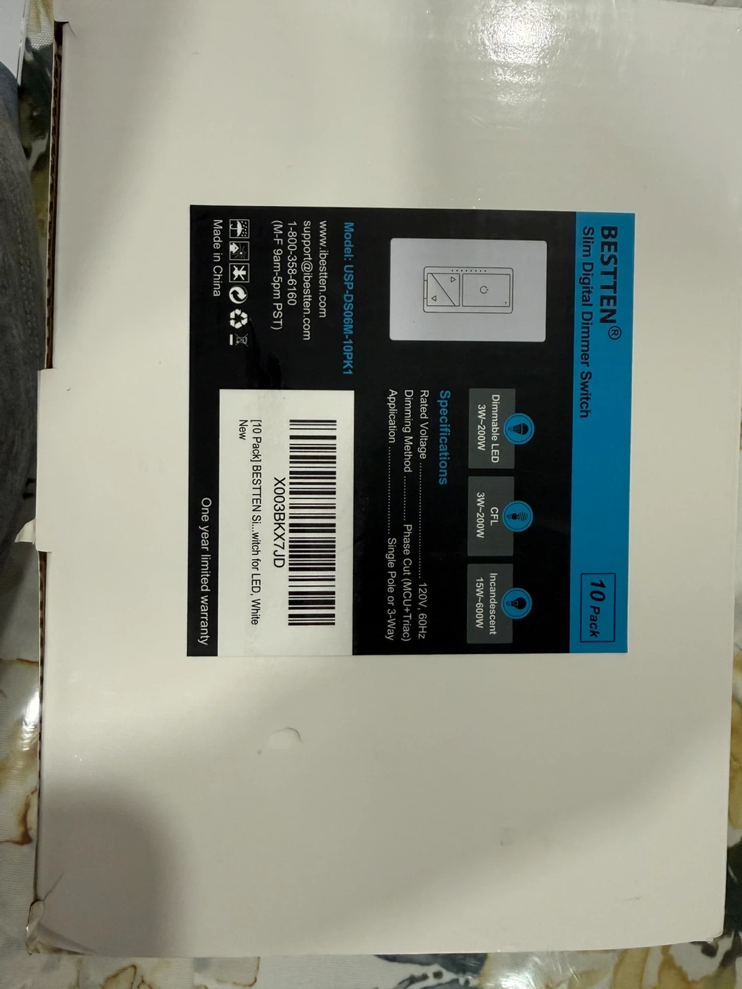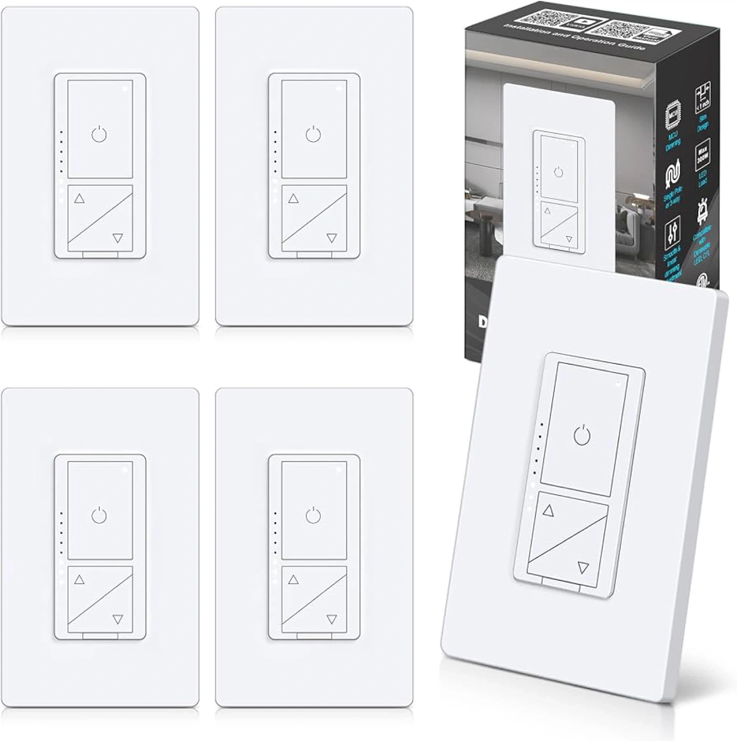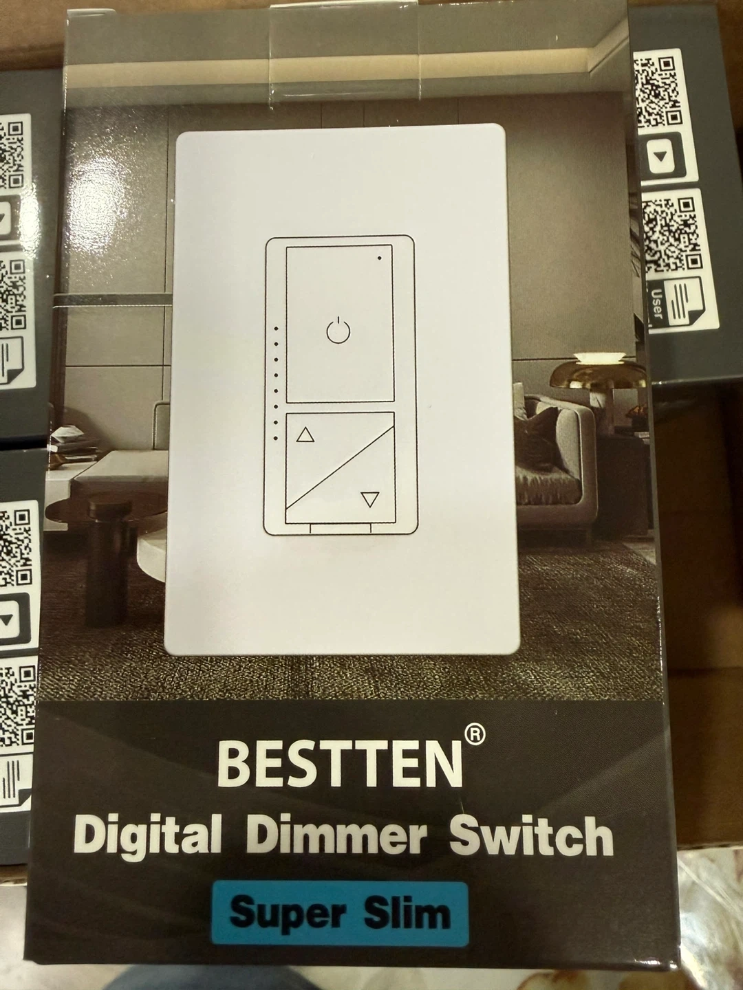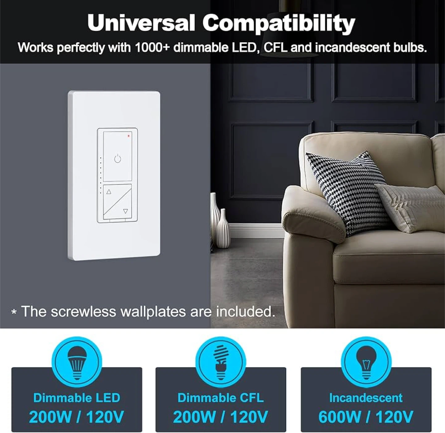 This BESTTEN digital dimmer switch offers precise control for your lights. It's a 3-button design with an on/off button and up/down dimming buttons. Screwless wallplates are included (8 SETS)