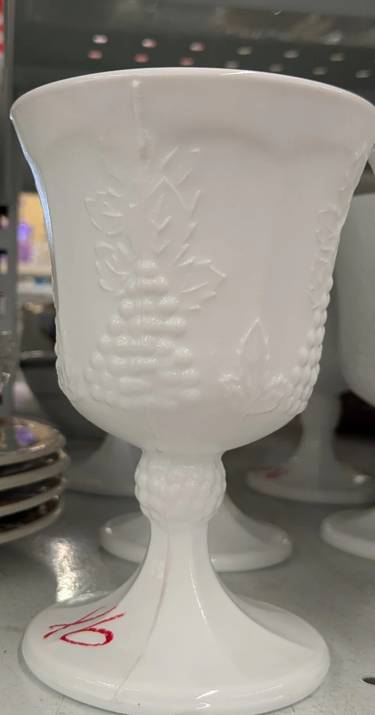 This white milk glass goblet features a beautiful grapevine embossed design. It's made of solid glass. This piece is great for special occasions or as a decorative item! Have 6 a set