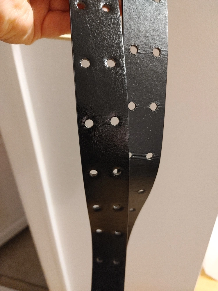 A classic black leather belt with a brass buckle. It features multiple holes for adjustable sizing. Leather material.