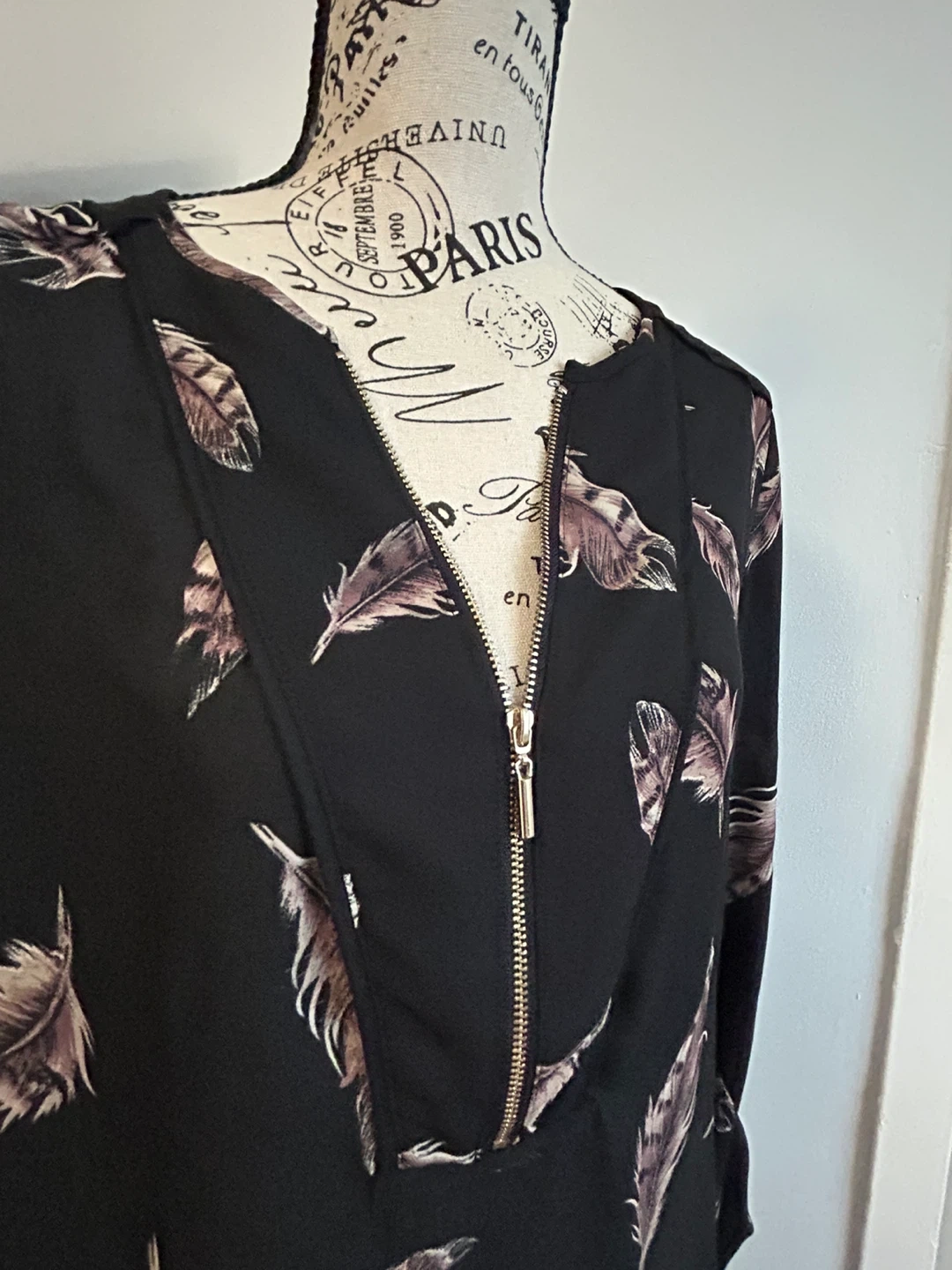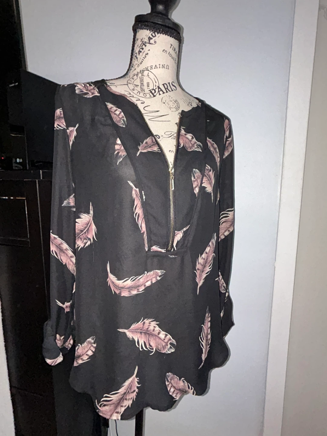 Black blouse with a feather print all over. It features a zip-up neckline and long sleeves. Made from a lightweight material. Size is TP/XS. Is like a small medium