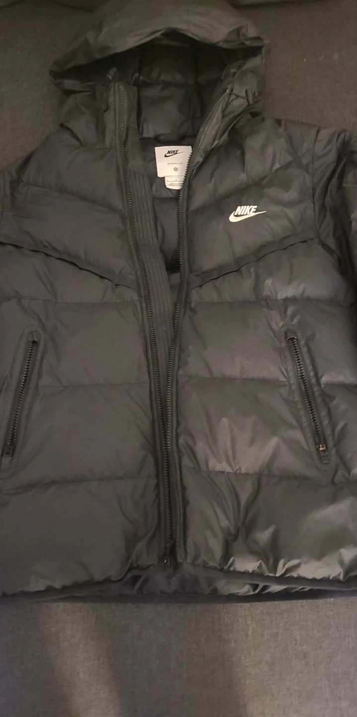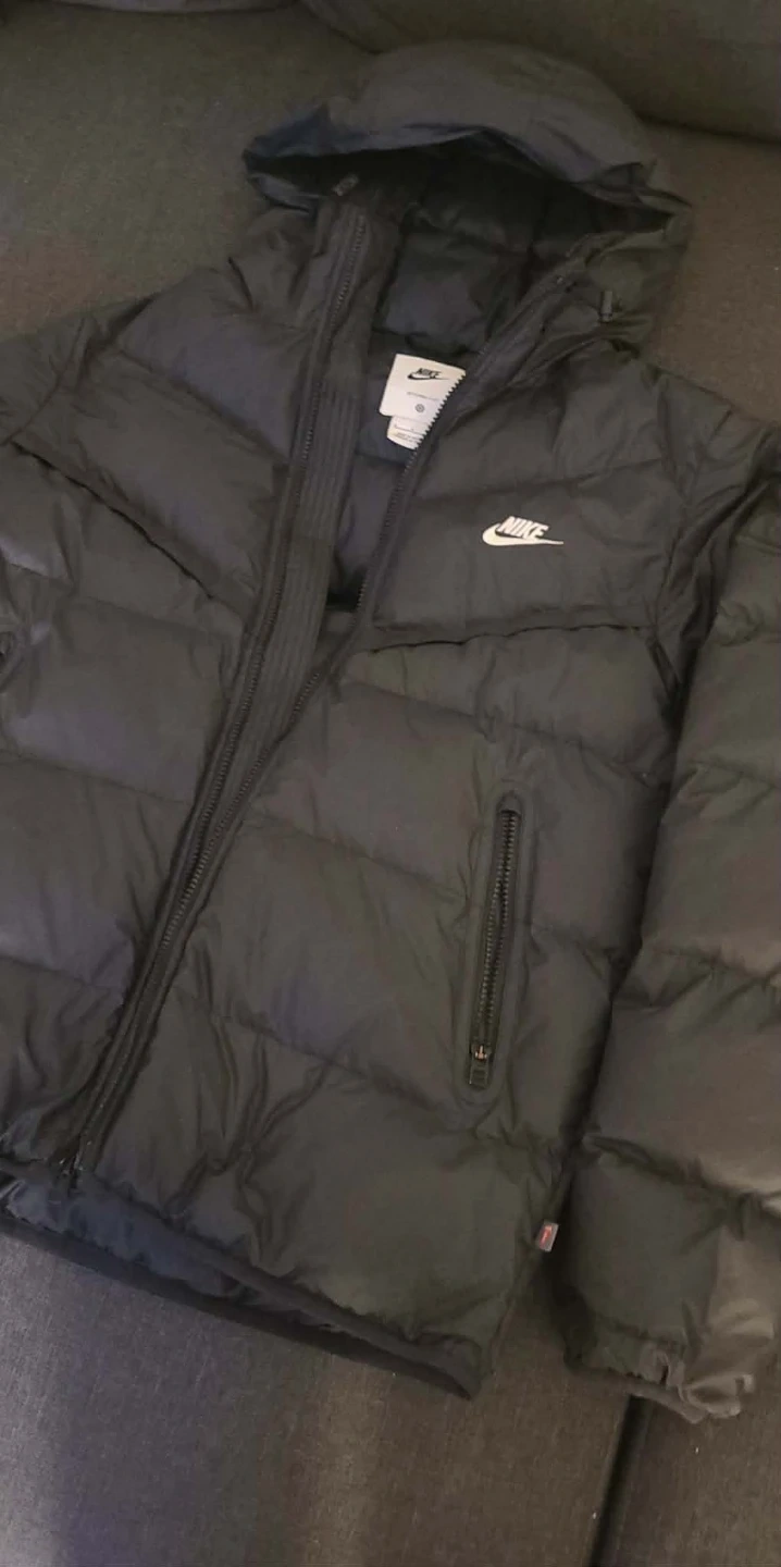 Nike puffer jacket with a hood. It's black and has a full zip closure with zippered pockets. Great for staying warm!