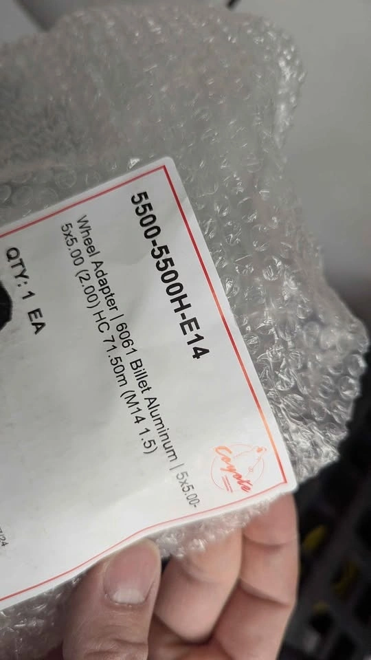Set of FOUR (4) Coyote wheel adapters. Made from 6061 billet aluminum. These are 2 inch thick, 5x5.00 bolt pattern, and have M14x1.5 studs. Hub centric 71.50mm. Part number 5500-5500H-E14.