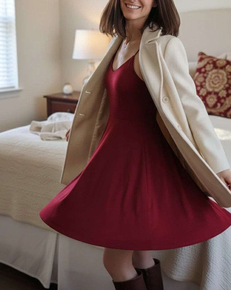 The Perfect Twirl: Crafted with a beautifully draped skirt that has a lovely flared body. It moves and twirls gracefully with you, adding a playful, feminine touch to your look.Designed to enhance your natural shape without being restrictive. The subtle A-line silhouette hits at the perfect spot just above the knee for a 5'7" frame, offering versatile length.
