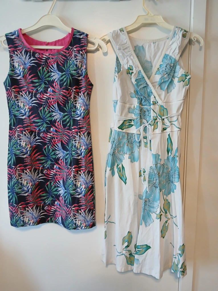 Two Medium size dresses are up for grabs! One is a sleeveless dress with a vibrant floral print in shades of navy, pink, and green. The other is a white dress with a lovely blue floral pattern. Both are in great condition and ready for a new home