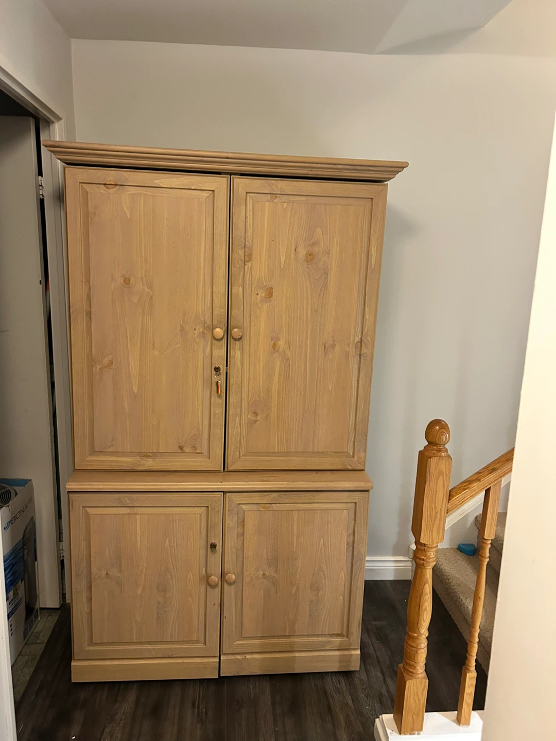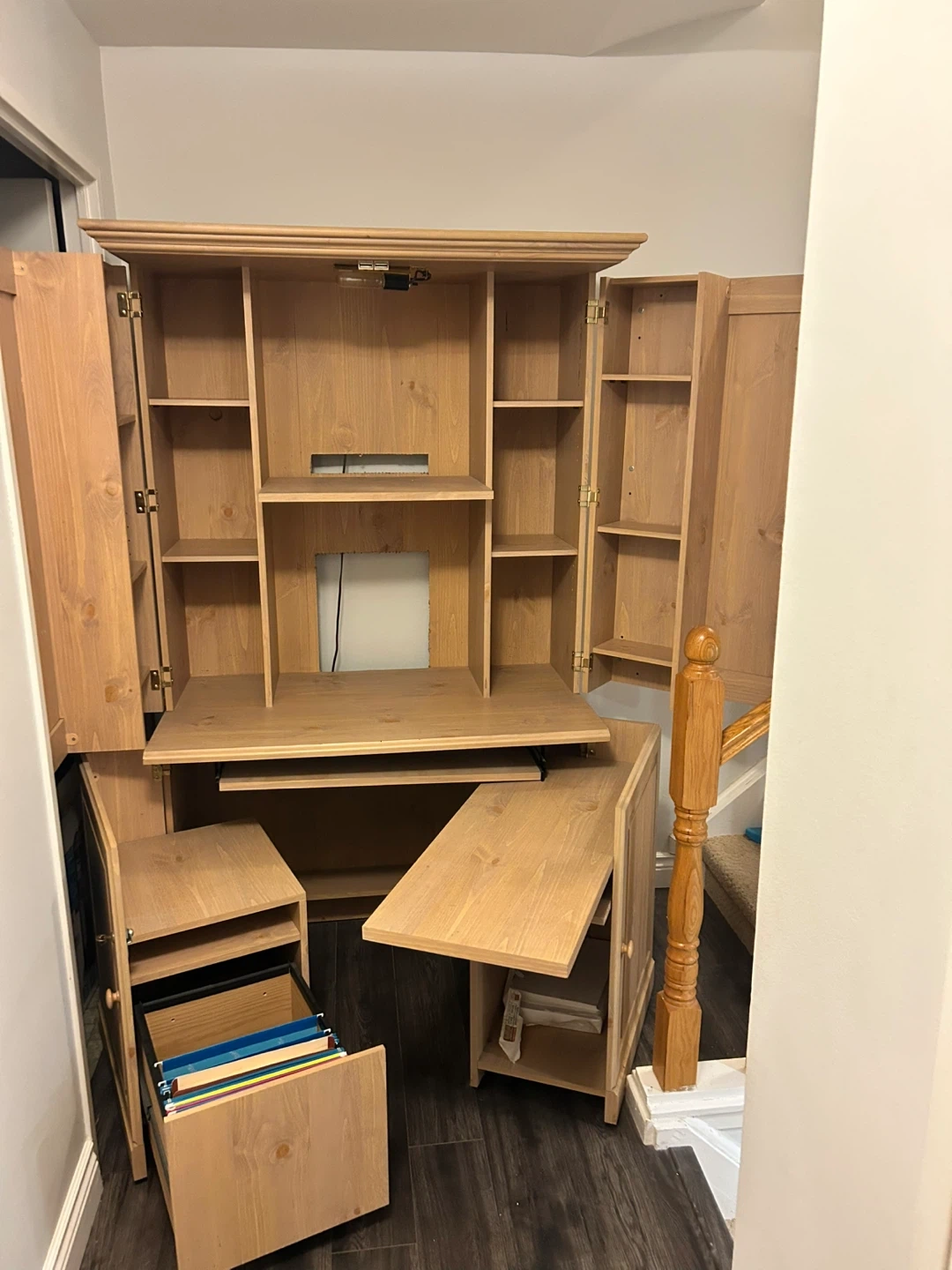 Desk closes up to armoire and locks. Upper shelves with light, holds printer, desktop computer, with keyboard tray.
