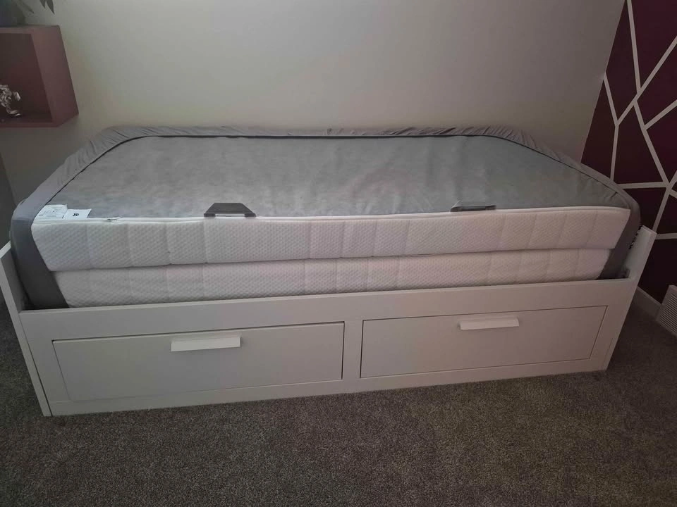 Very well-maintained Daybed Frame with mattress. Selling because of moving. Color is white. Size shown in pictures. Includes bed frame and 2 twin mattresses. No rips or stains. Only used a couple of times, and the mattress was always used with a protector. This bed has been in the guest room and not used much. With this Daybed, you can quickly and easily create space for overnight guests. Just pull out the bed base, and you get a double bed in no time. The large drawers have space for extra duvet, pillows, and other items you need to store.