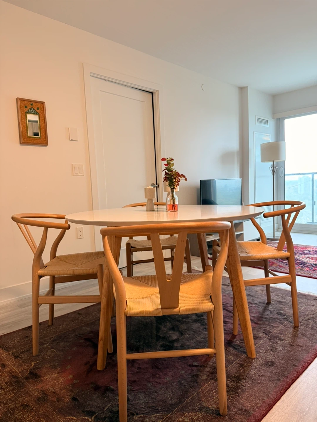 Selling a lovely round dining table paired with four wishbone chairs. The table features a clean, white top and a sturdy base. The chairs are made of natural wood with woven seats, adding a touch of Scandinavian design to your dining space. Perfect for a cozy dining area or kitchen!